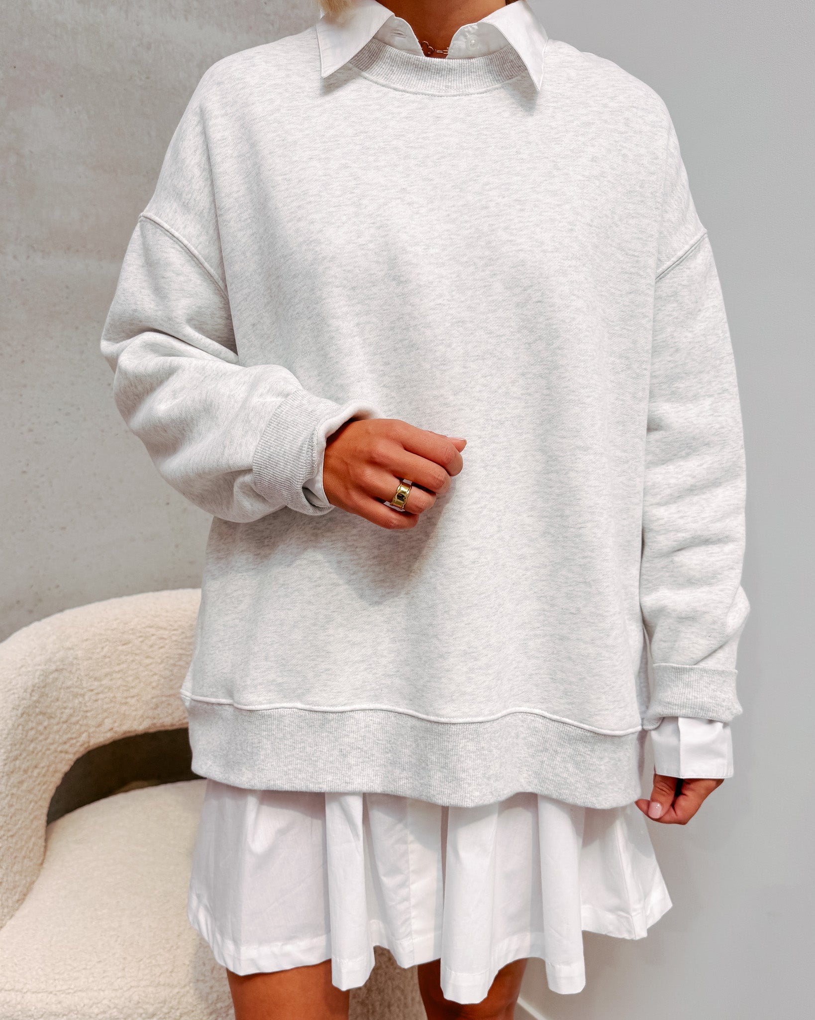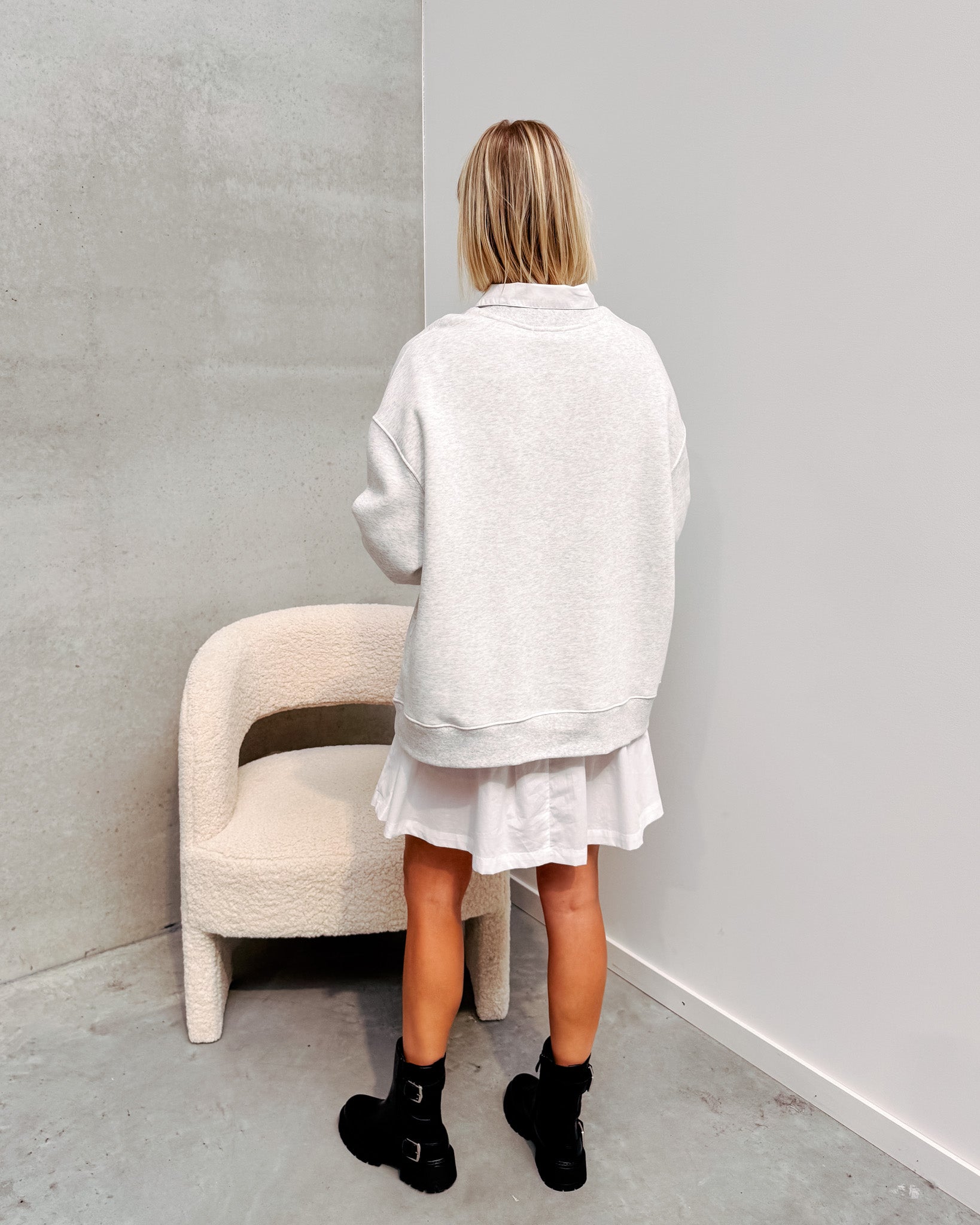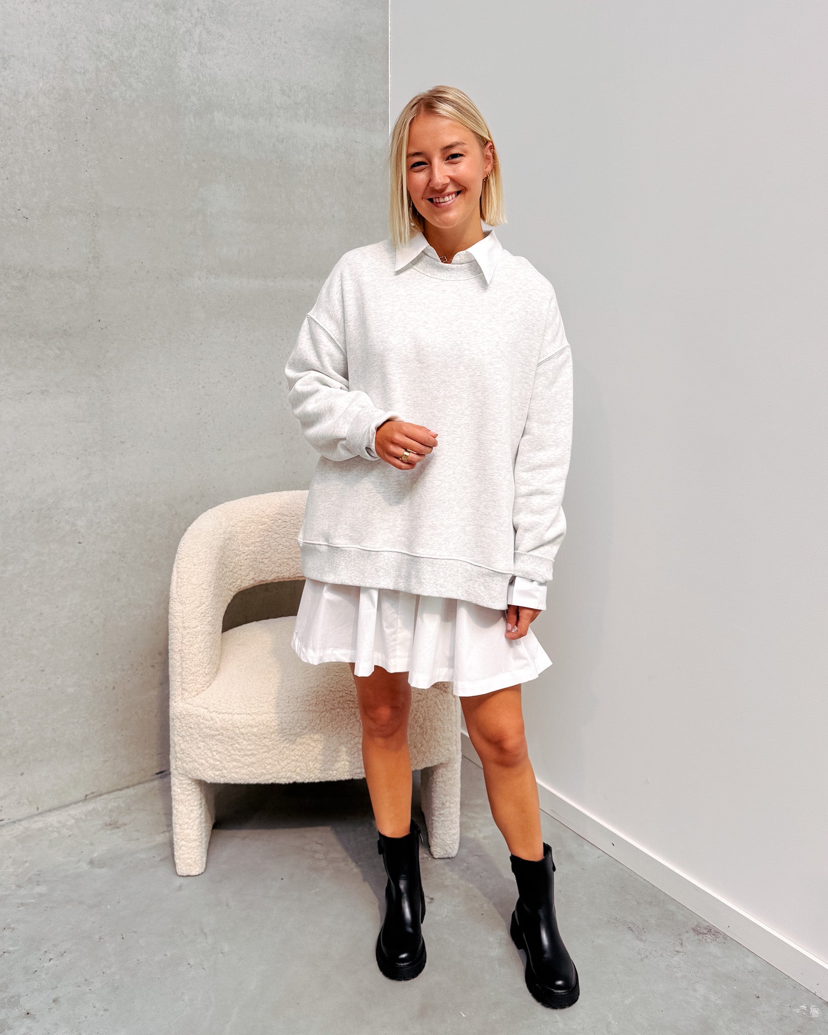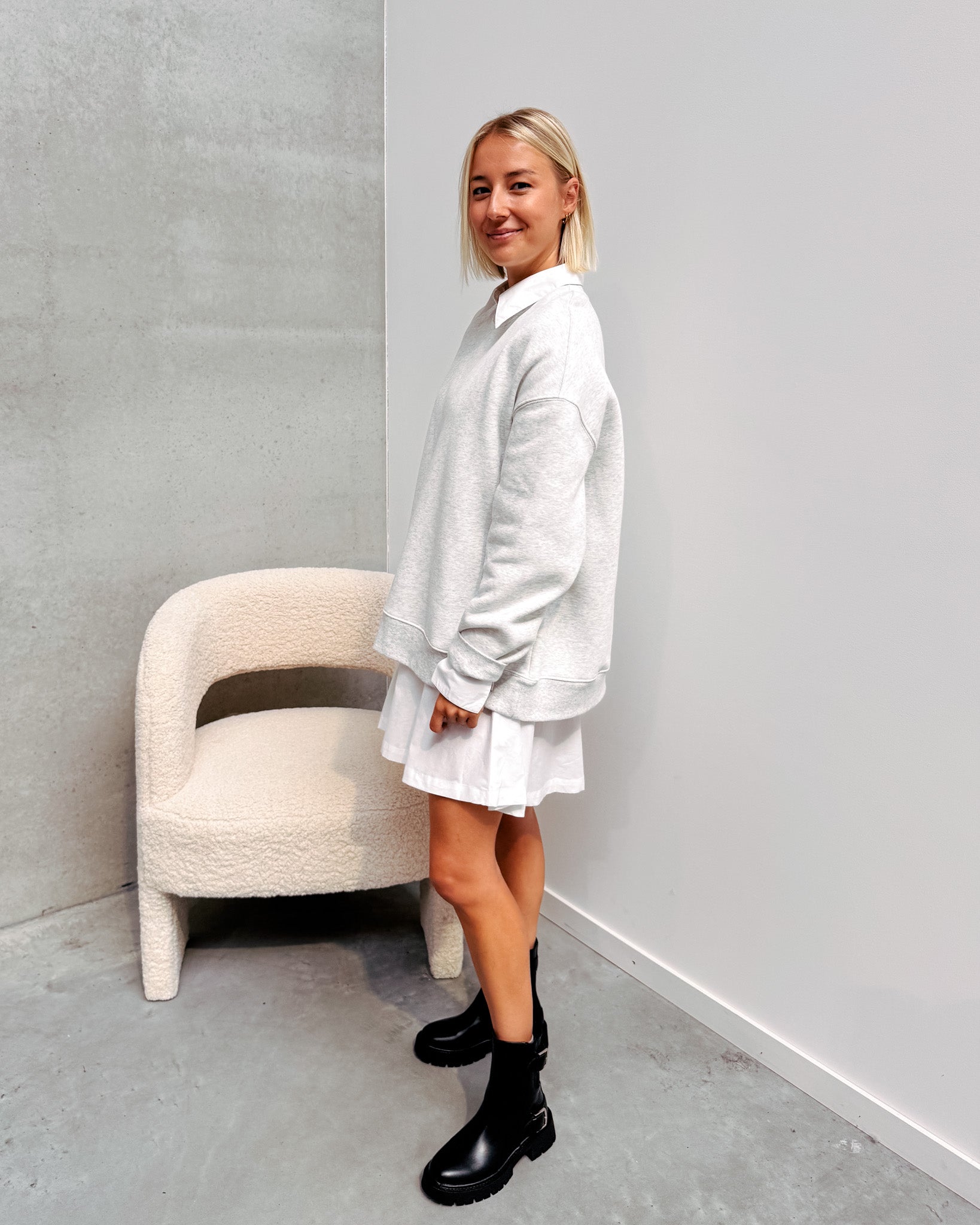 De sweater heeft een oversized model! Deze sweater draagt heel comfortabel aan. De sweater is aan de binnenkant afgewerkt met een zachte fleece stof, ook heeft het leuke zakjes! Wij combineerden de sweater met de 'MIMMI SHIRT DRESS - WHITE' en 'BLISS BUCKLE BOOTS' samen vormen ze een perfect match! Door de trui op het jurkje te combineren, werd het een wat stoerdere look! We raden aan om de trui met de hand te wassen.