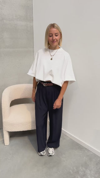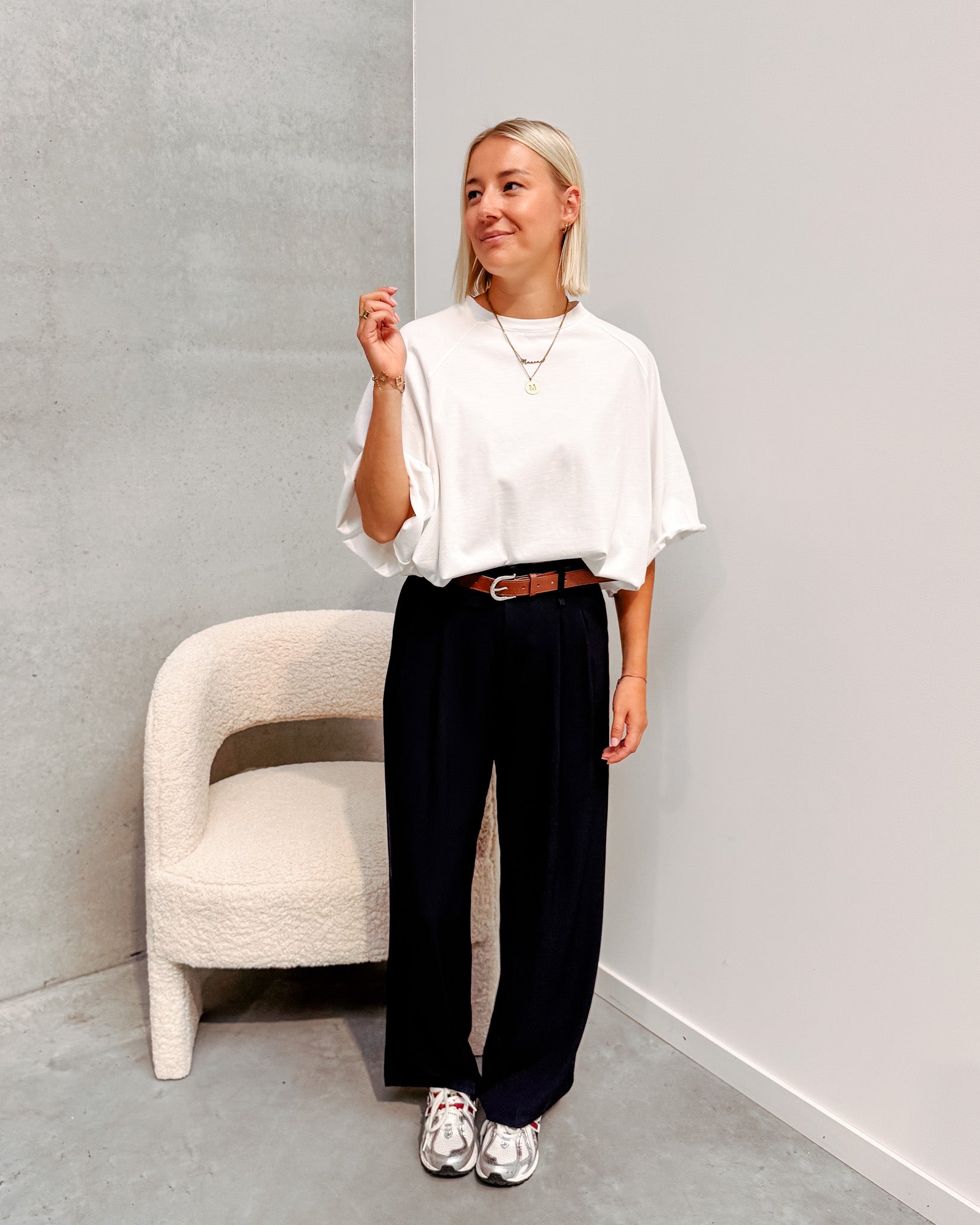 De broek heeft een klassiek gekleed model en zit heel comfortabel aan. Deze broek sluit met een rits vooraan, er zit een bruin riempje bij dat perfect bij de broek kan gedragen worden. Wij combineerden de broek met de ’MILO OVERSIZED TEE - WHITE’ samen vormen ze een mooi geheel!