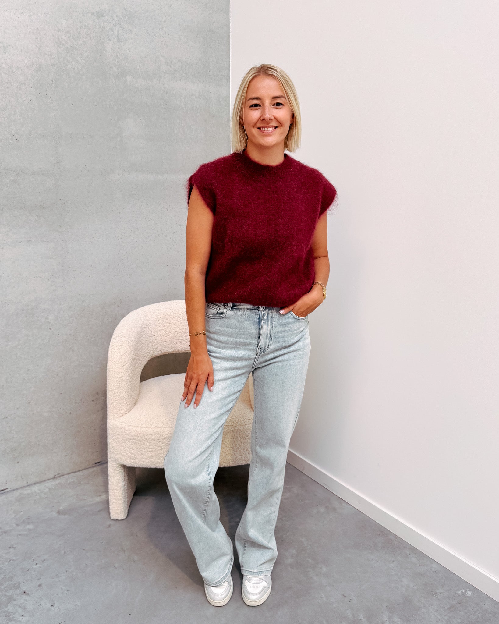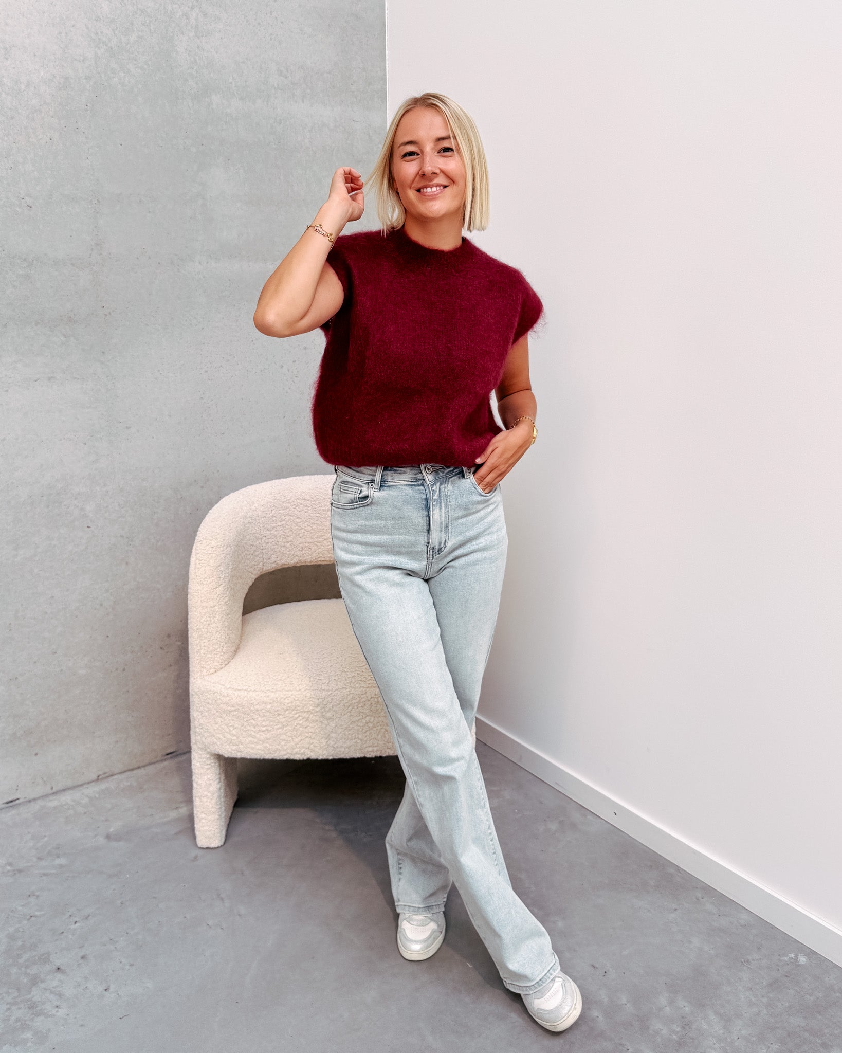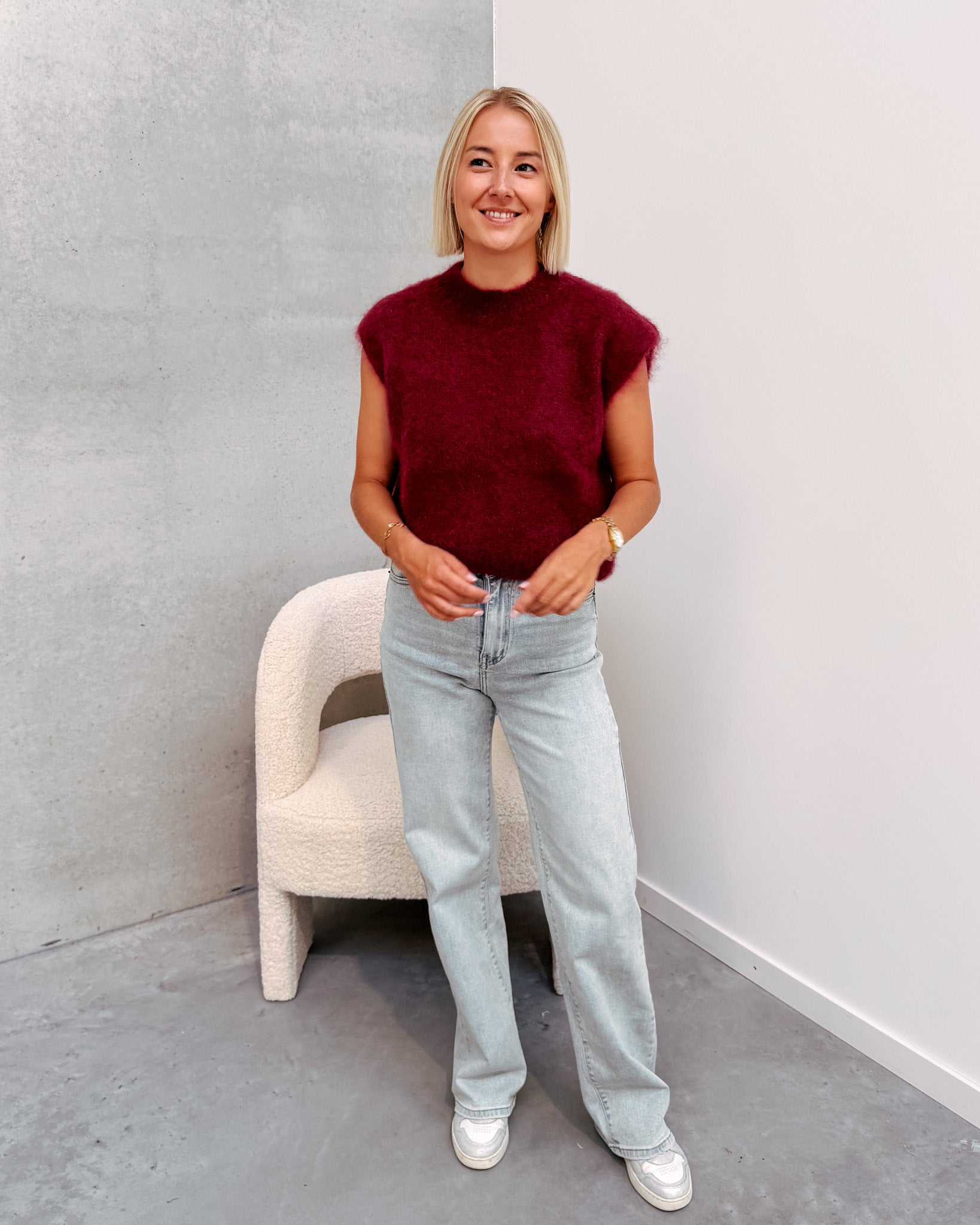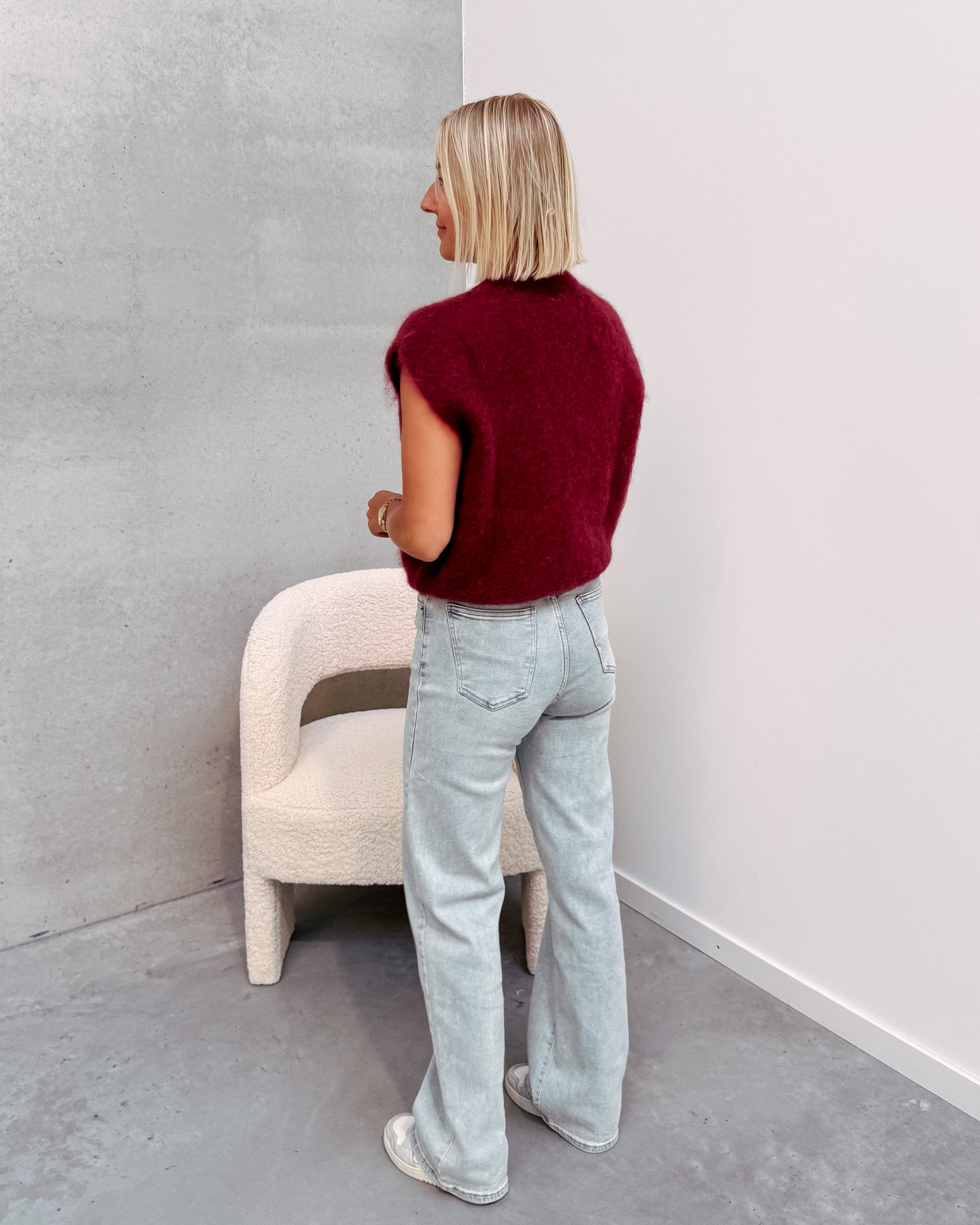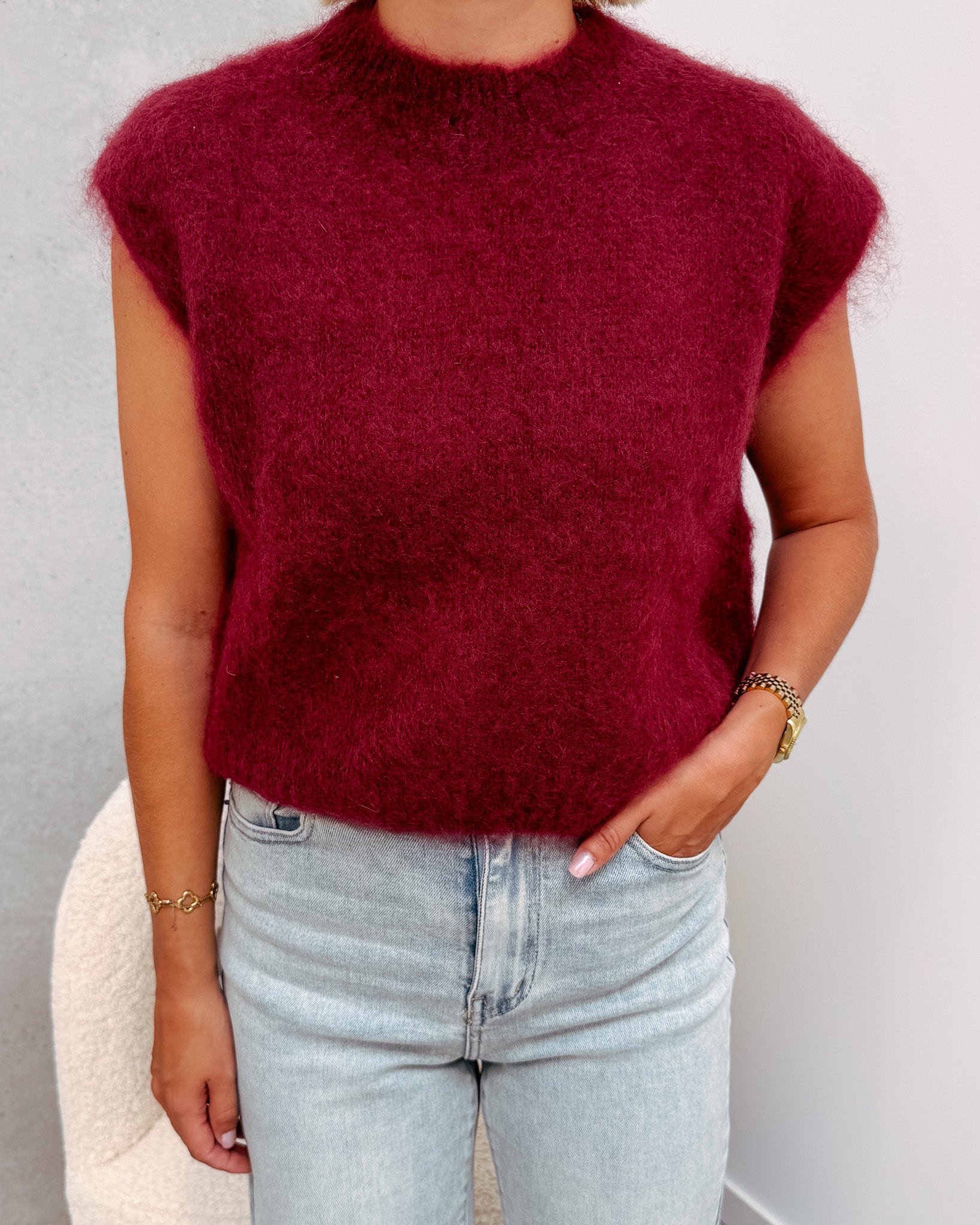 Deze spencer is de musthave voor in jouw kast! Het is een mouwloos truitje en heeft een ronde hals. De trui kan prikken als je hier gevoelig voor bent. De spencer heeft een mooie bordeaux kleur! We combineerden de spencer met de 'JAMIE WIDE JEANS', samen vormen ze een mooi geheel. Ook superleuk om te combineren met een t-shirt of longsleeve. We raden aan het truitje met de hand te wassen.