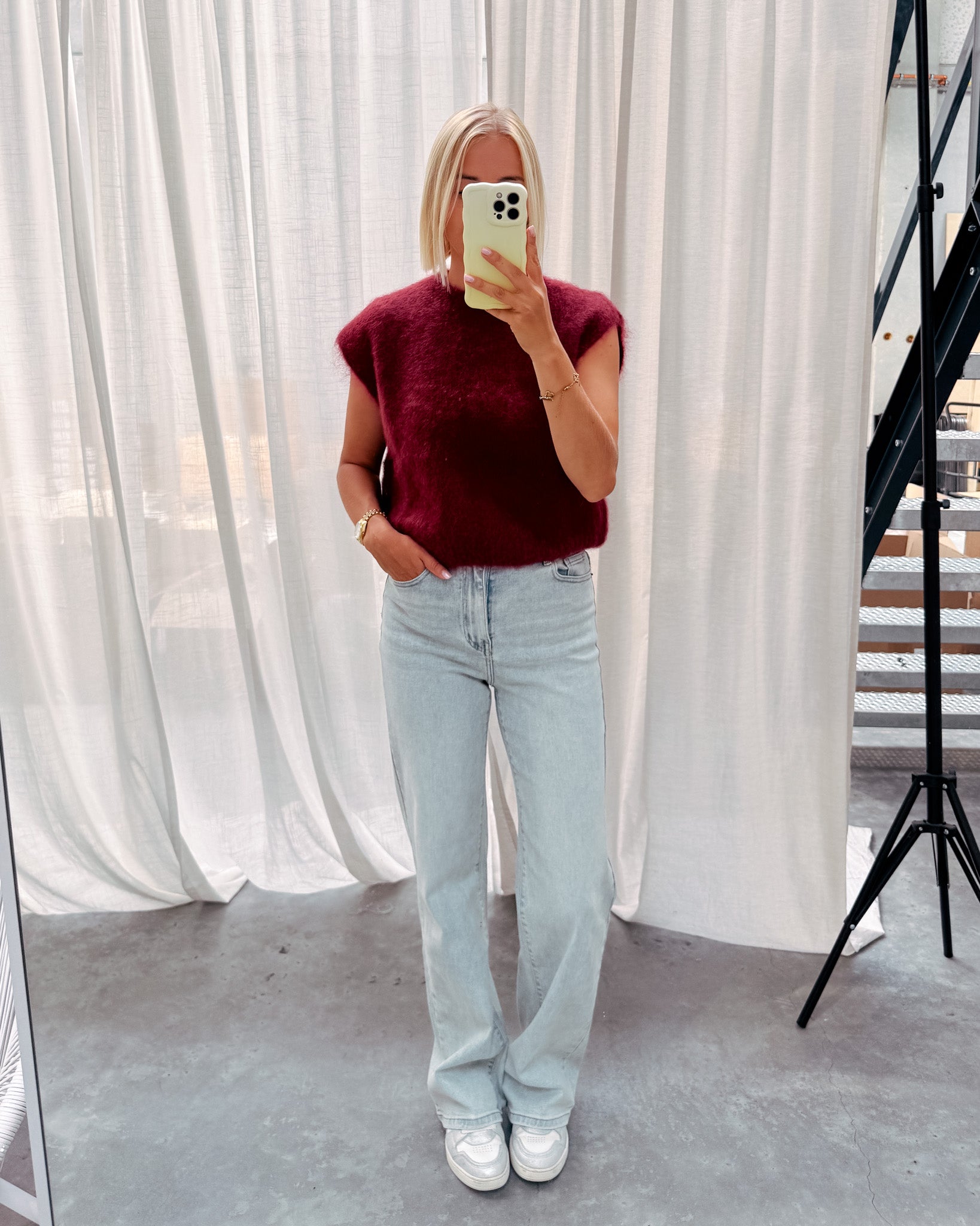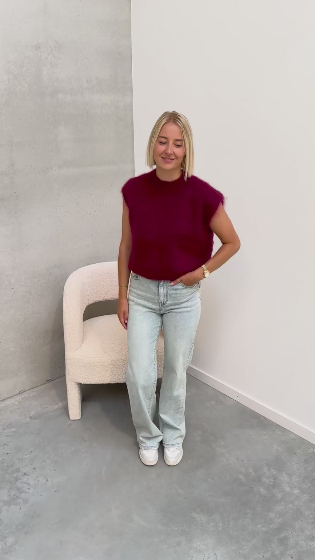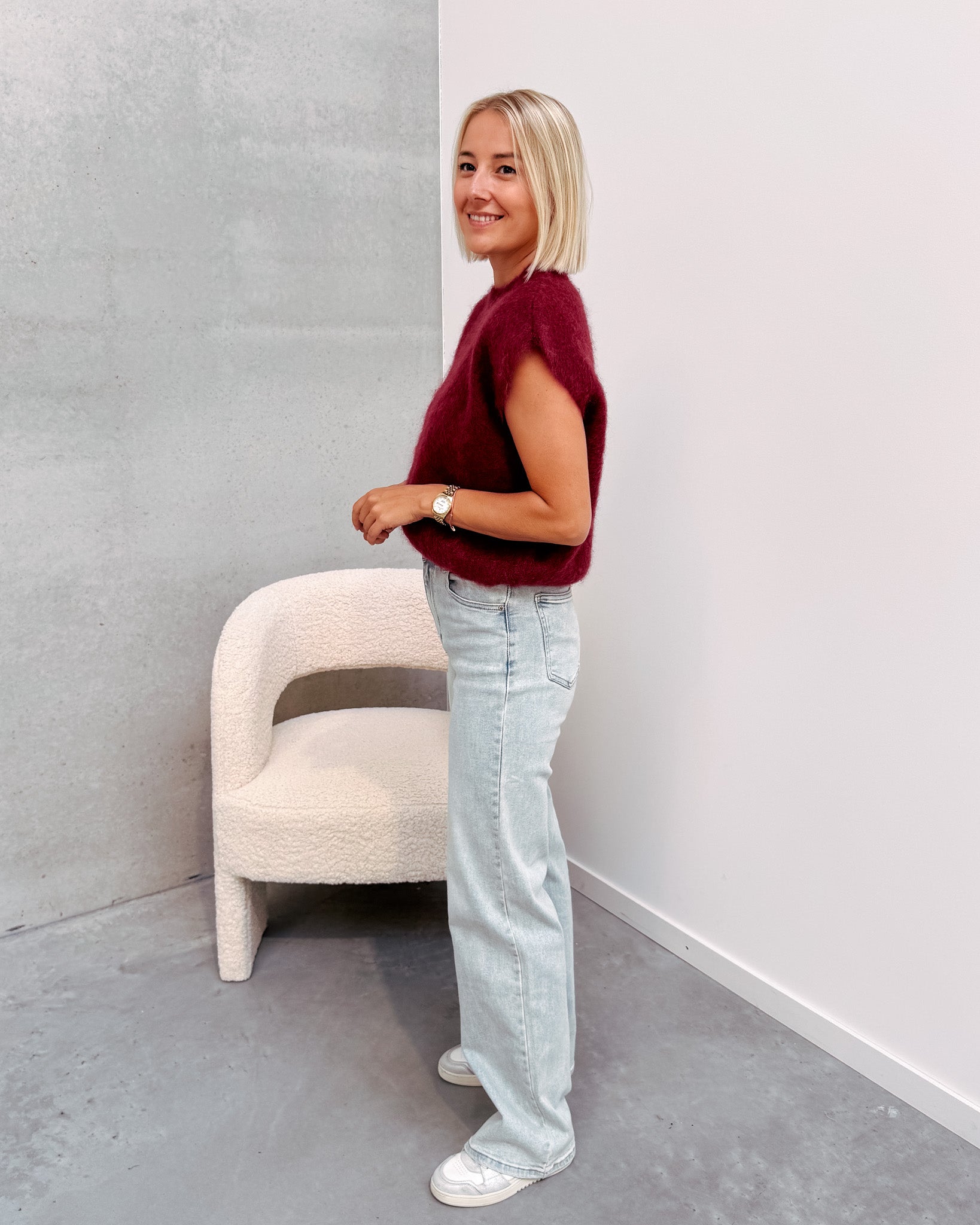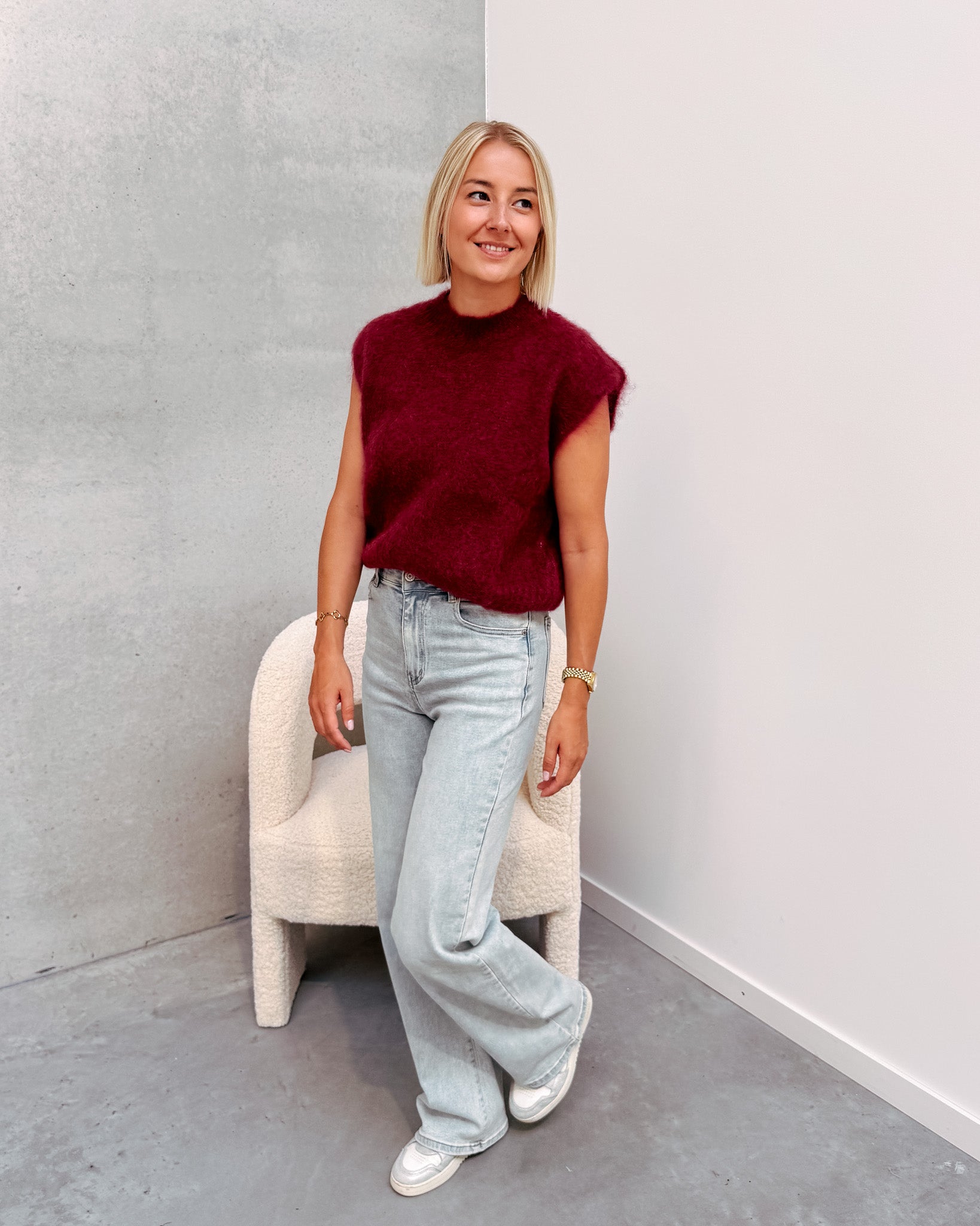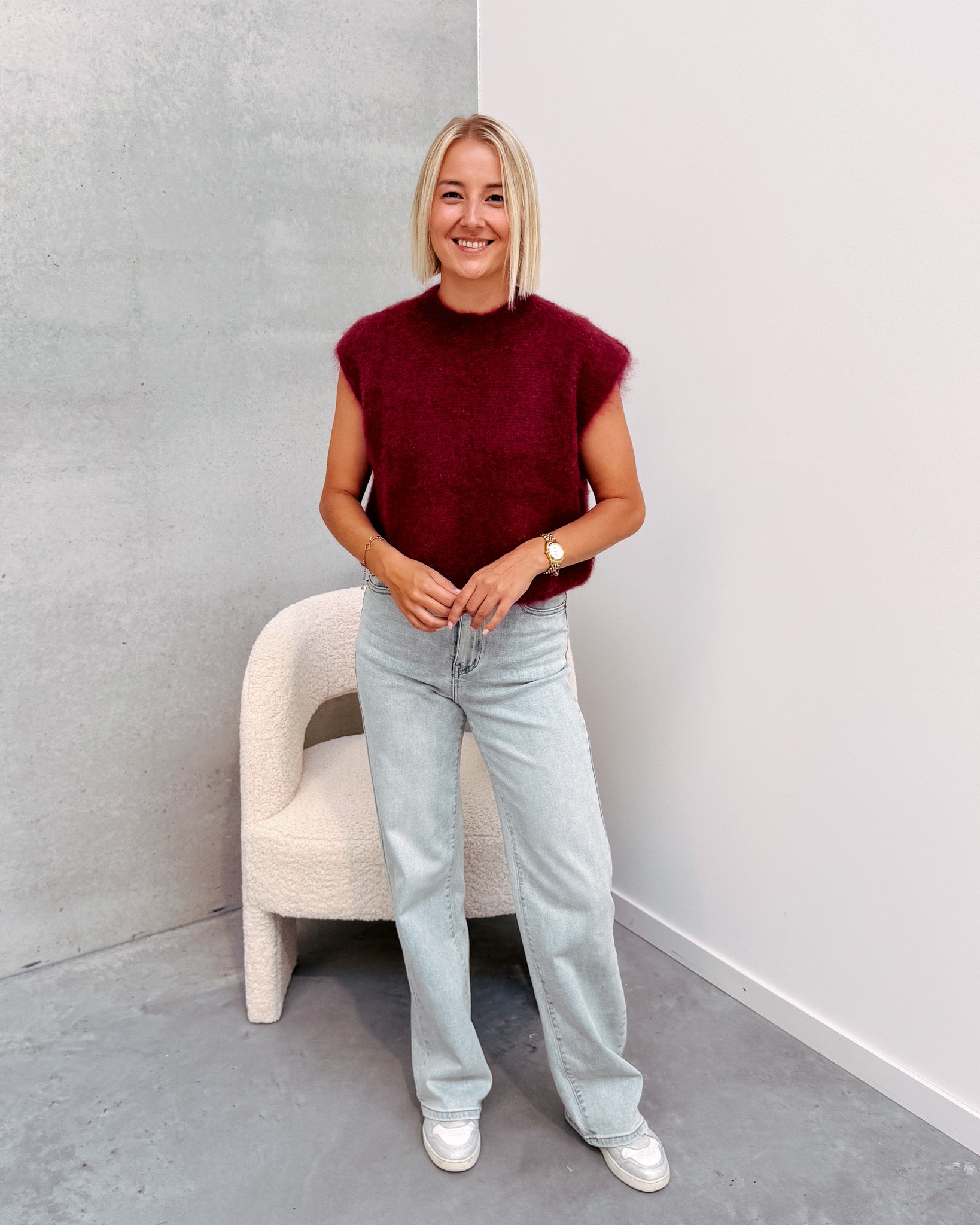 Deze spencer is de musthave voor in jouw kast! Het is een mouwloos truitje en heeft een ronde hals. De trui kan prikken als je hier gevoelig voor bent. De spencer heeft een mooie bordeaux kleur! We combineerden de spencer met de 'JAMIE WIDE JEANS', samen vormen ze een mooi geheel. Ook superleuk om te combineren met een t-shirt of longsleeve. We raden aan het truitje met de hand te wassen.