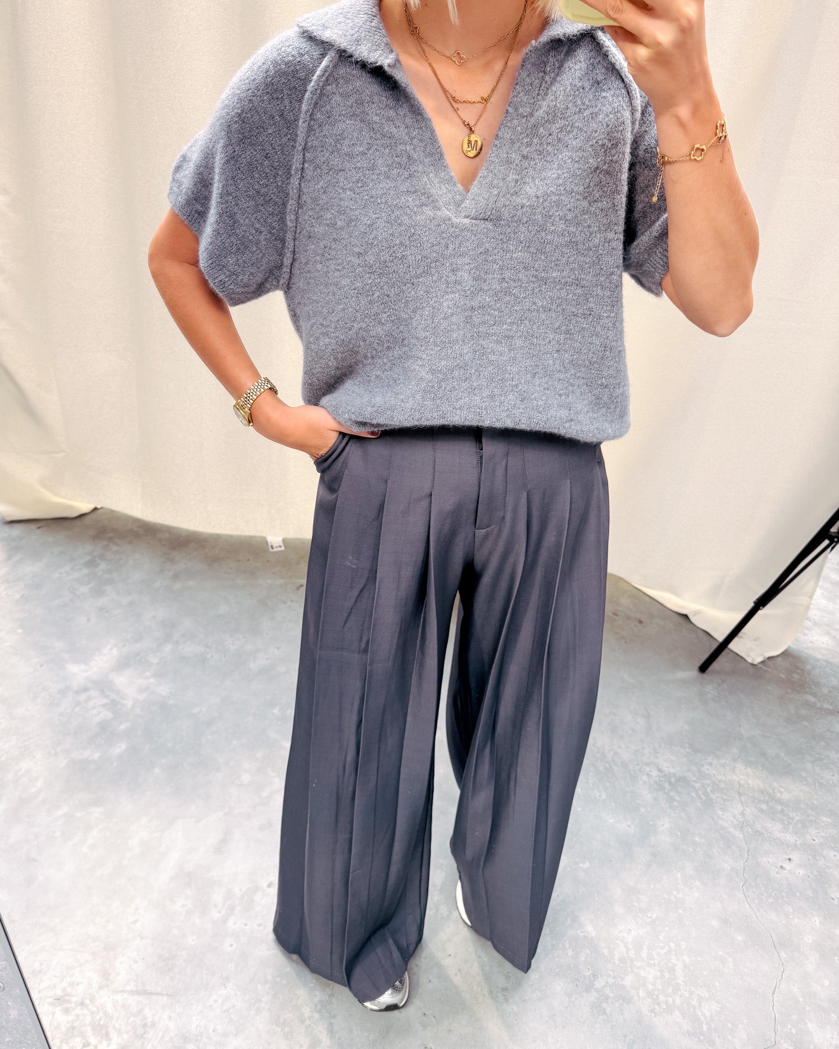 De broek heeft een gekleed model en zit heel comfortabel aan. Deze broek sluit met een rits en knopje vooraan. De broek heeft een mooi aanpassend en flatterend model. Ook heeft deze handige zakjes en valt deze iets breder. De broek is afgewerkt met plissé details, deze geven de broek een extra touch! Wij combineerden de broek met de ’LIMA SHORT SLEEVE KNITS‘ samen vormen ze een perfect match!