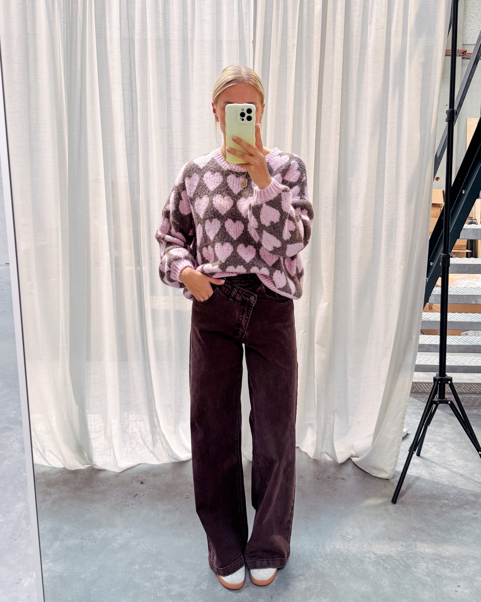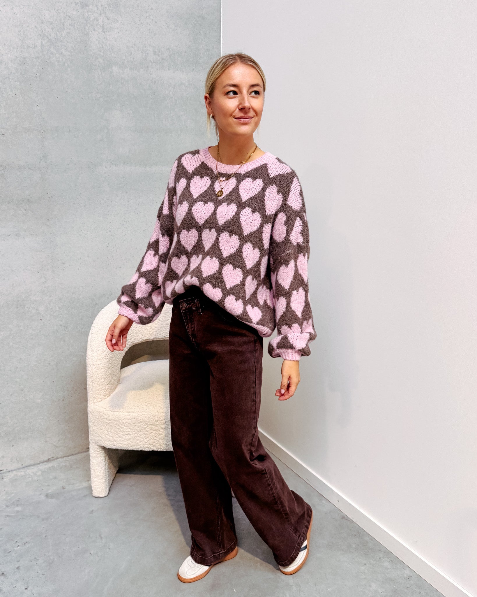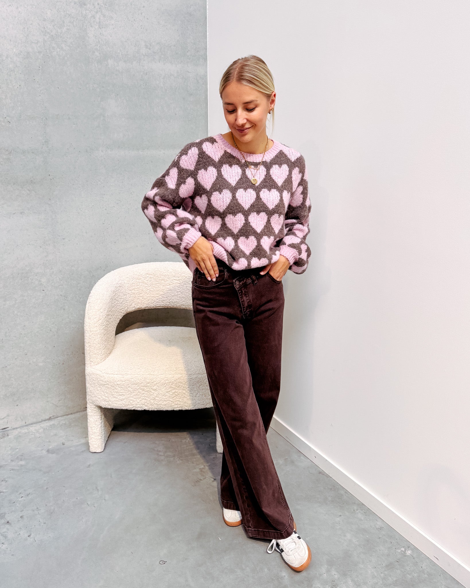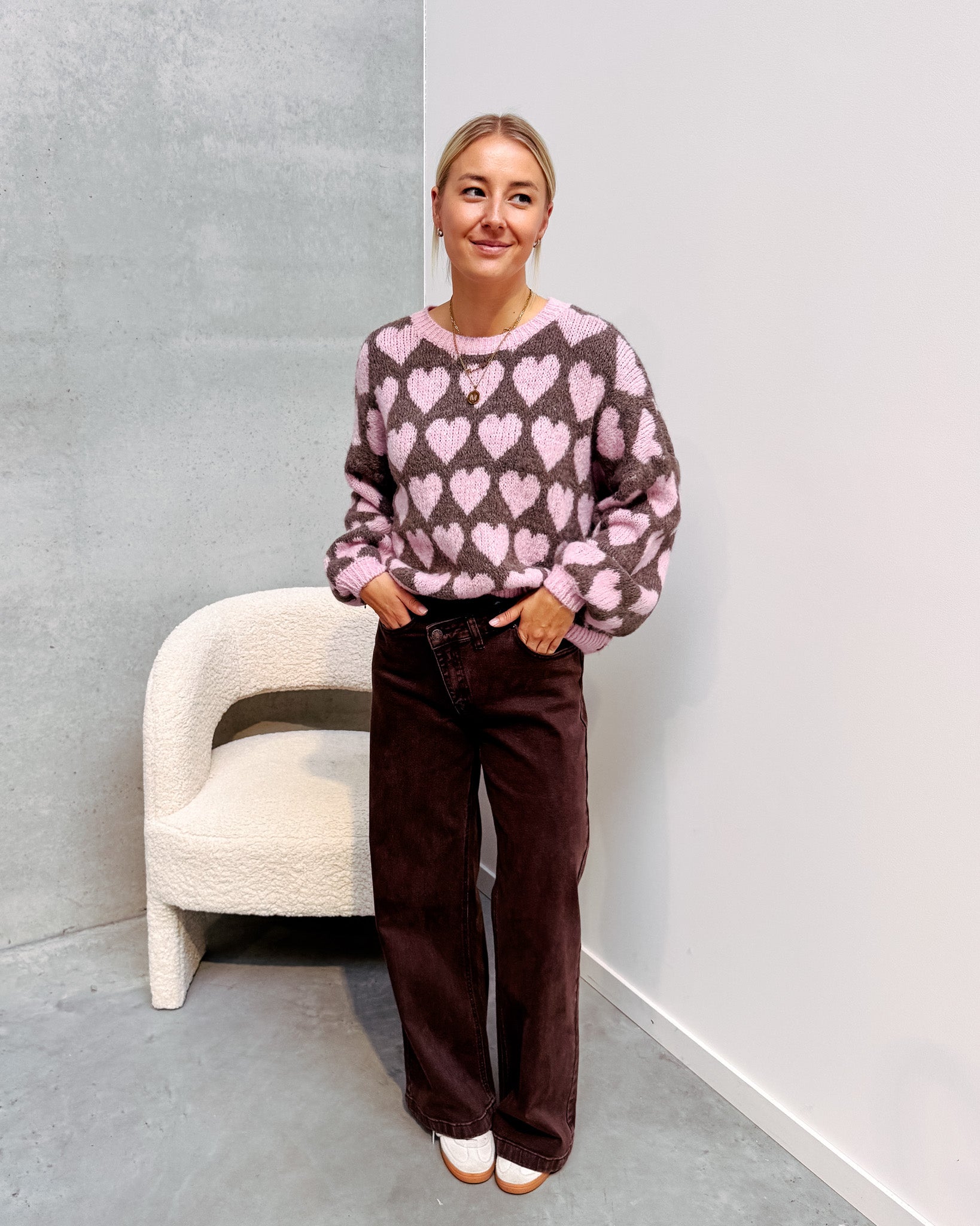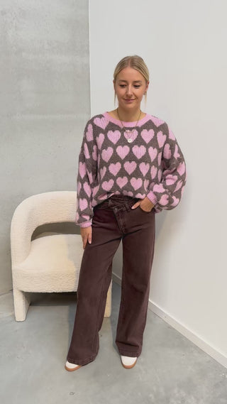 Deze trui heeft een heel schattig printje met hartjes! We love de kleurencombo van roze met bruin. De trui draagt heel zacht aan. Alhoewel er wol in zit, prikt deze niet! Wij combineerden de trui met de ‘ACE DENIM JEANS - BROWN’ samen vormen ze een perfect match! We raden aan de trui met de hand te wassen.