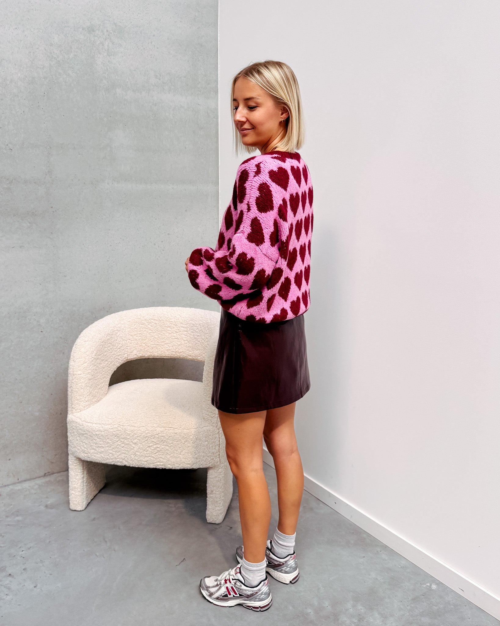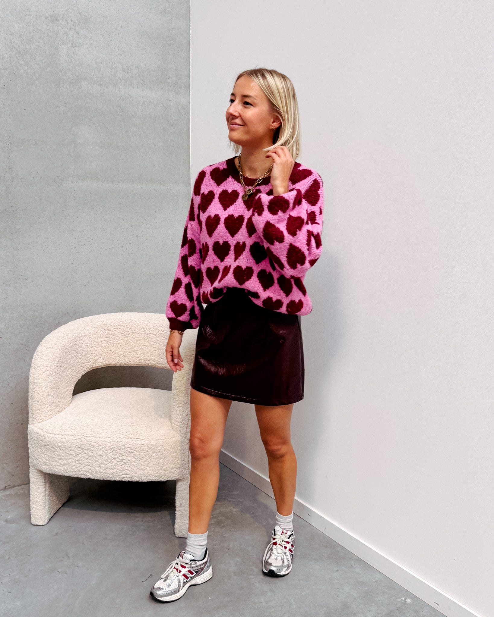 Deze trui heeft een heel schattig printje met hartjes! We love de kleurencombo van roze met bordeaux rood. De trui draagt heel zacht aan. Alhoewel er wol in zit, prikt deze niet! Wij combineerden de trui met de 'KIM BURGUNDY SKIRT' samen vormen ze een perfect match! We raden aan de trui met de hand te wassen.