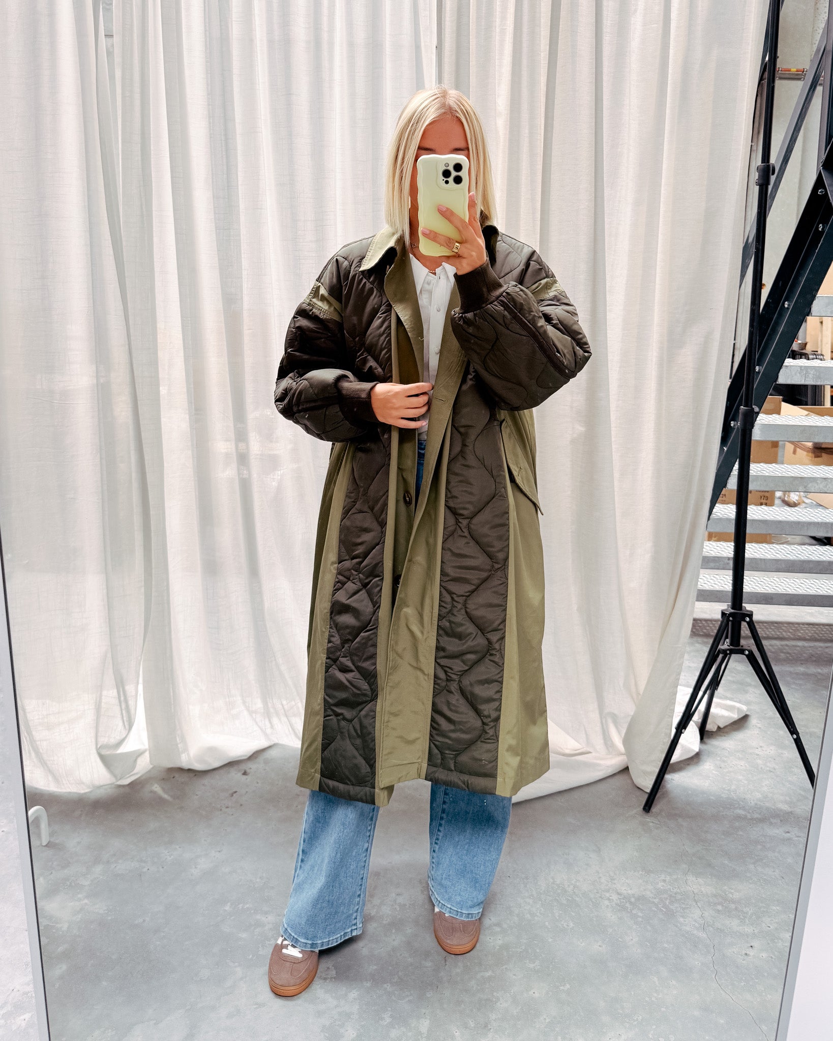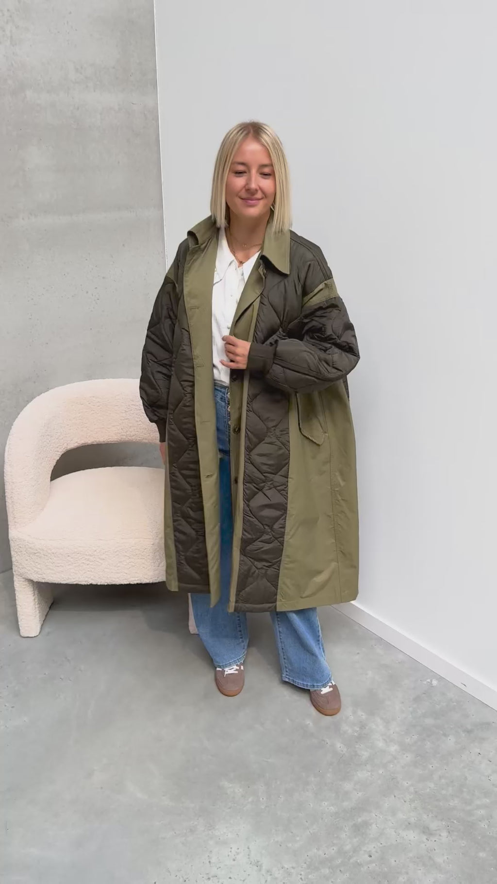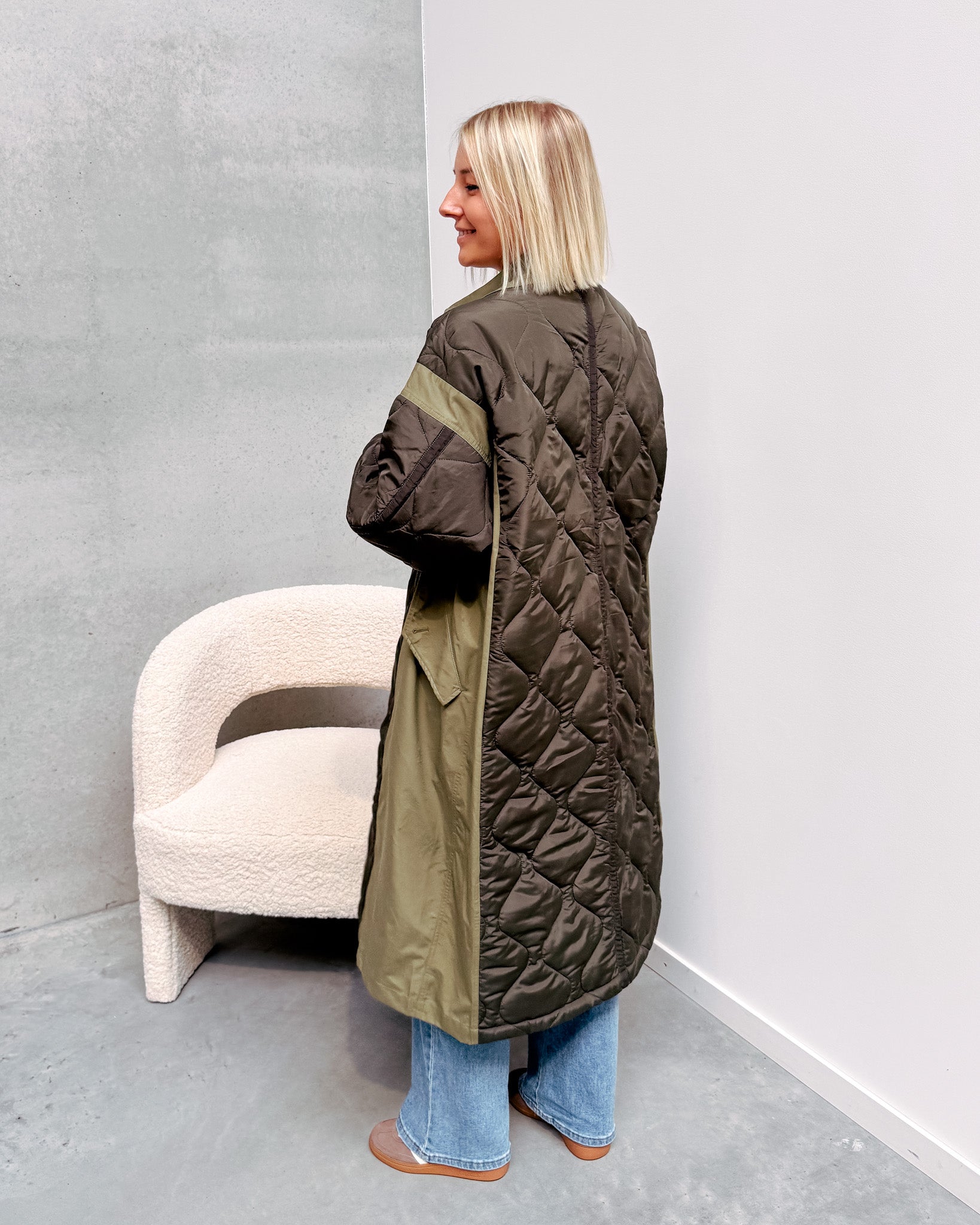 De jas is een toffe mix van een trenchcoat met een padded jacket! Deze jas valt heel lang en heeft een oversized model. Ook heeft de jas zakjes en een kraagje! Wij combineerden de jas met de 'MATHILDA BLOUSE - WHITE' en de 'BELLA BUTTON JEANS' samen vormen ze een leuke combo! We raden aan de jas met de hand te wassen.