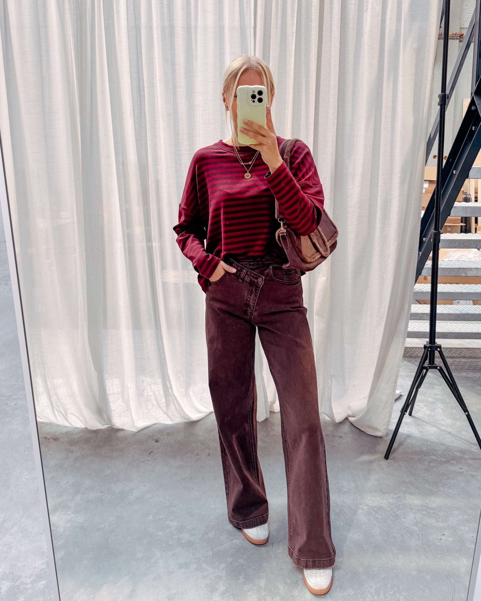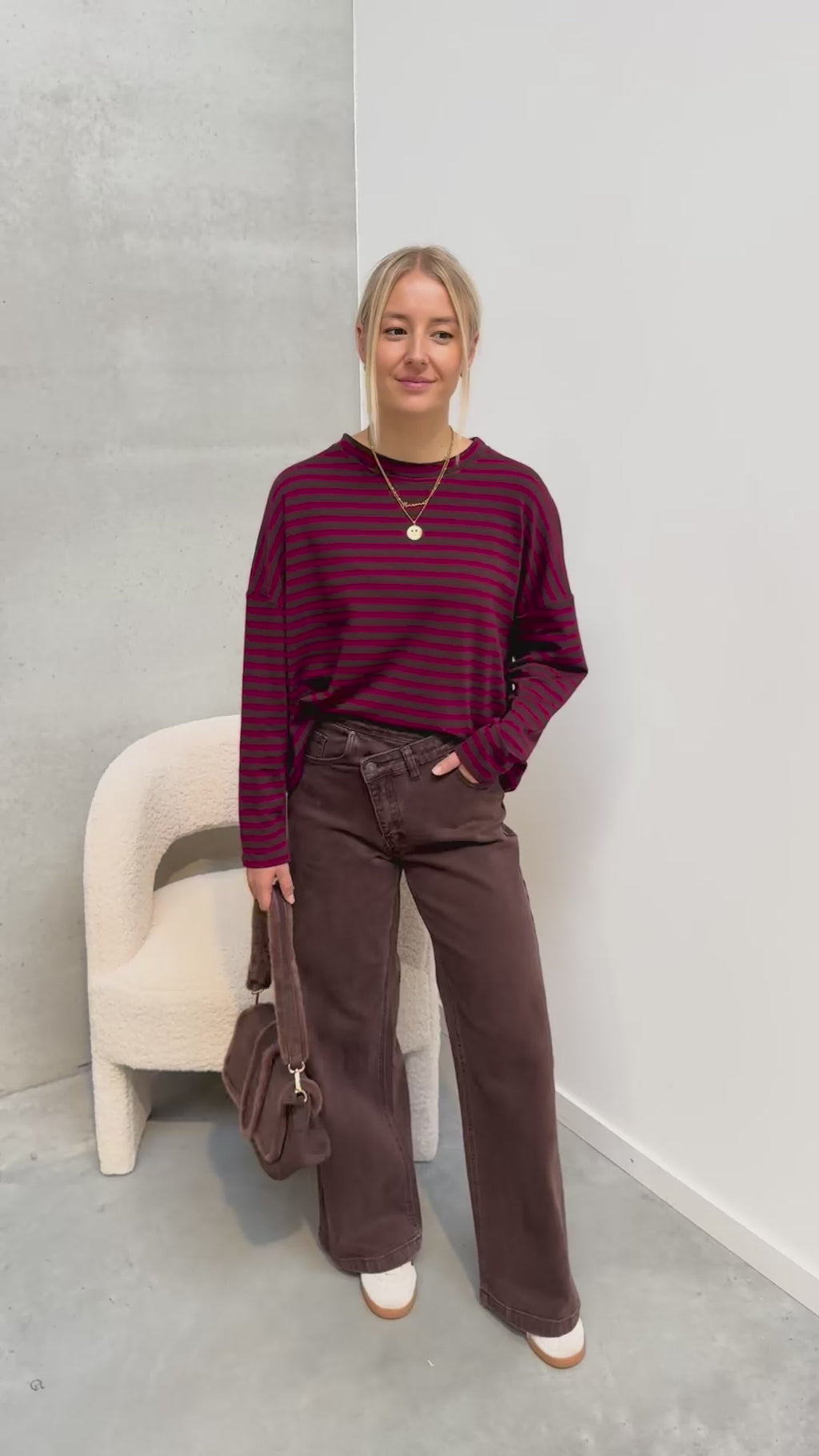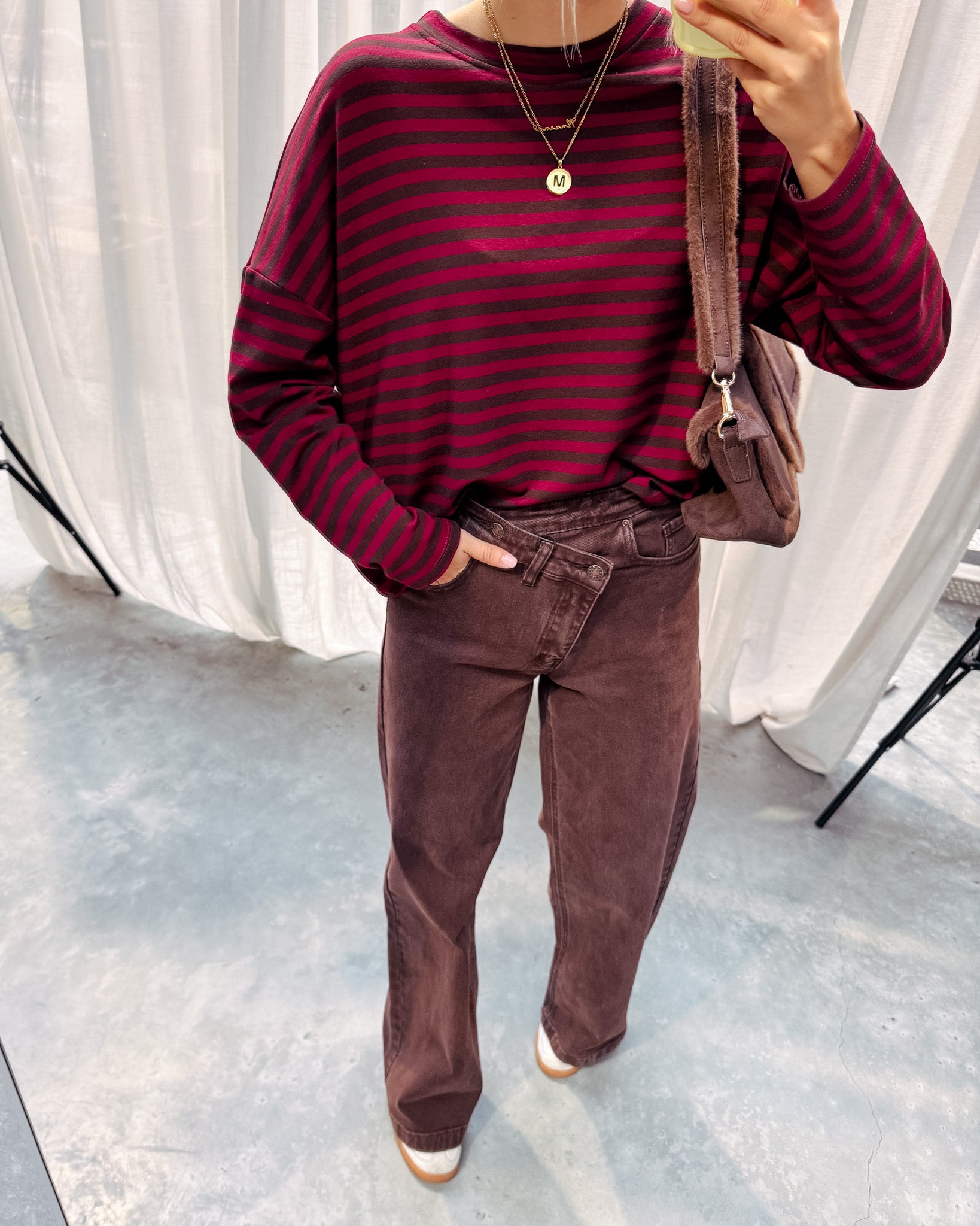 Het shirt heeft een los model met een tof streepjespatroon met een bordeaux touch! Wij combineerden het shirt met de ‘ACE DENIM JEANS - BROWN’ en ‘FUZZY BABE BAG - BROWN’ samen vormen ze een mooi geheel.