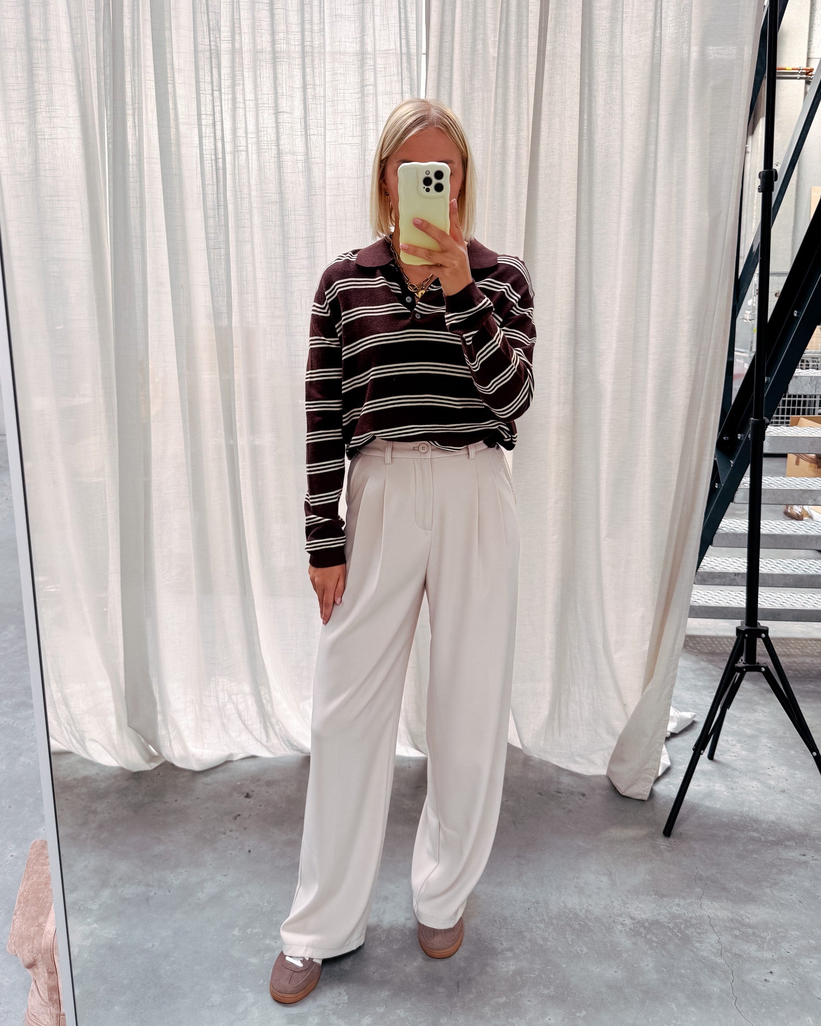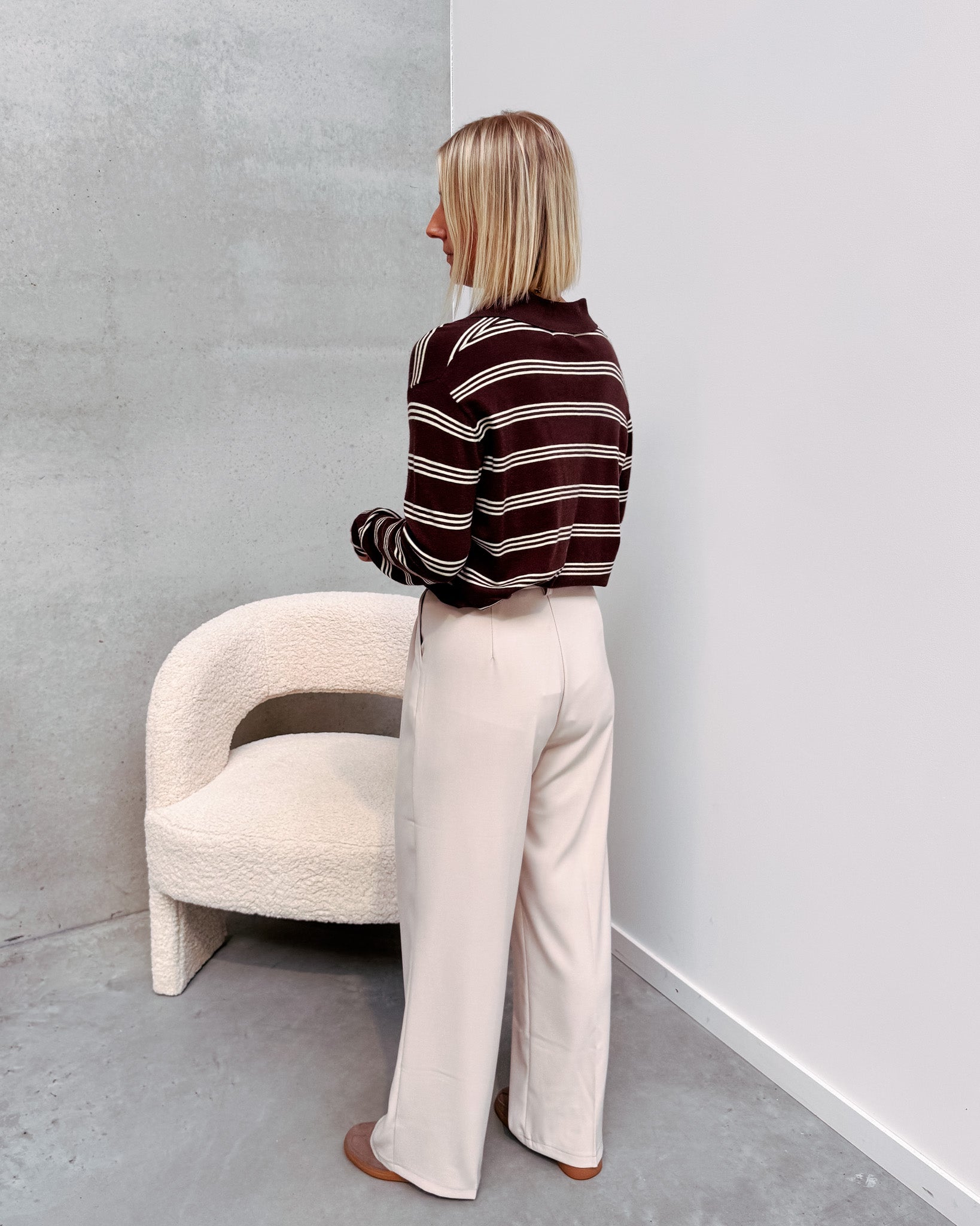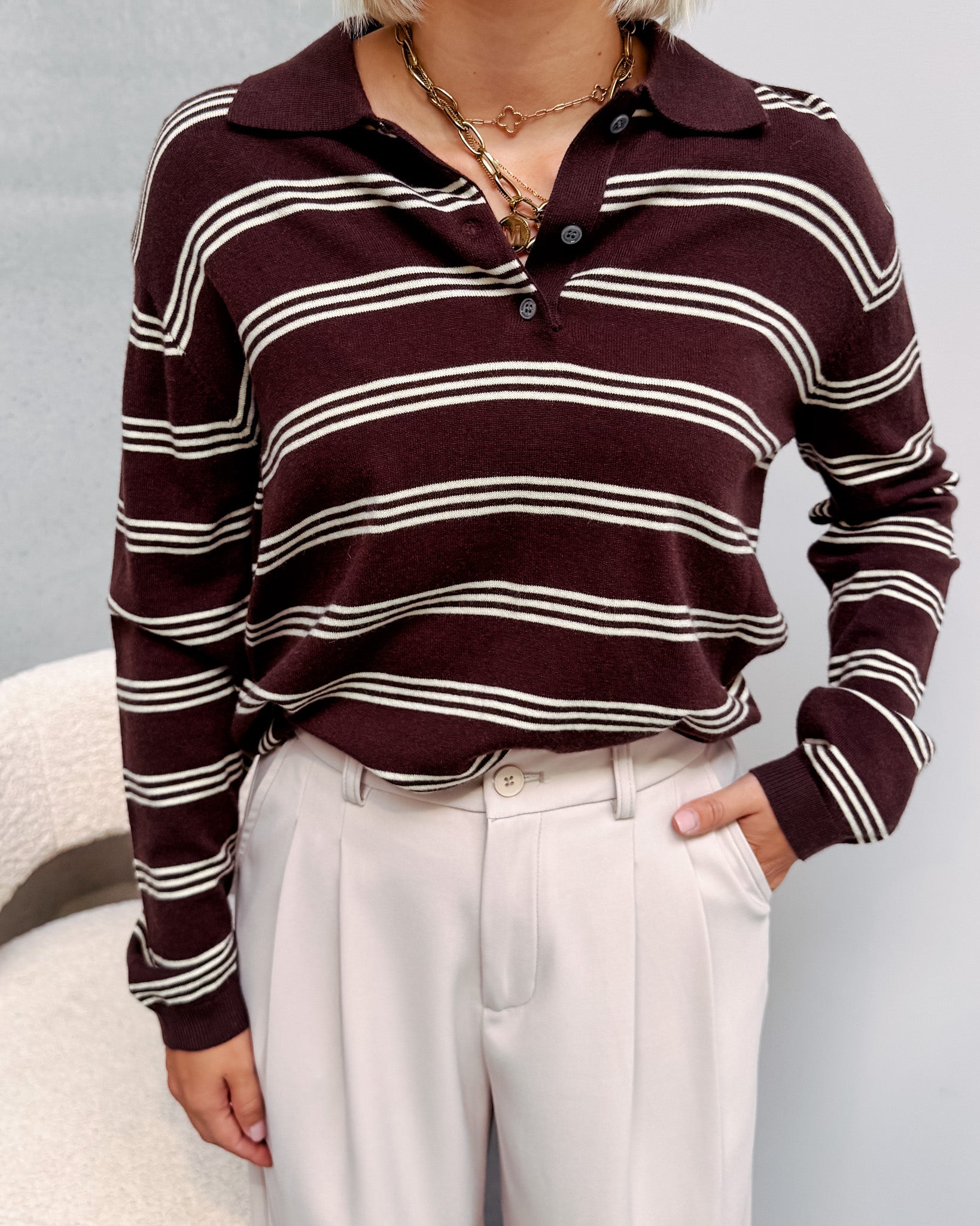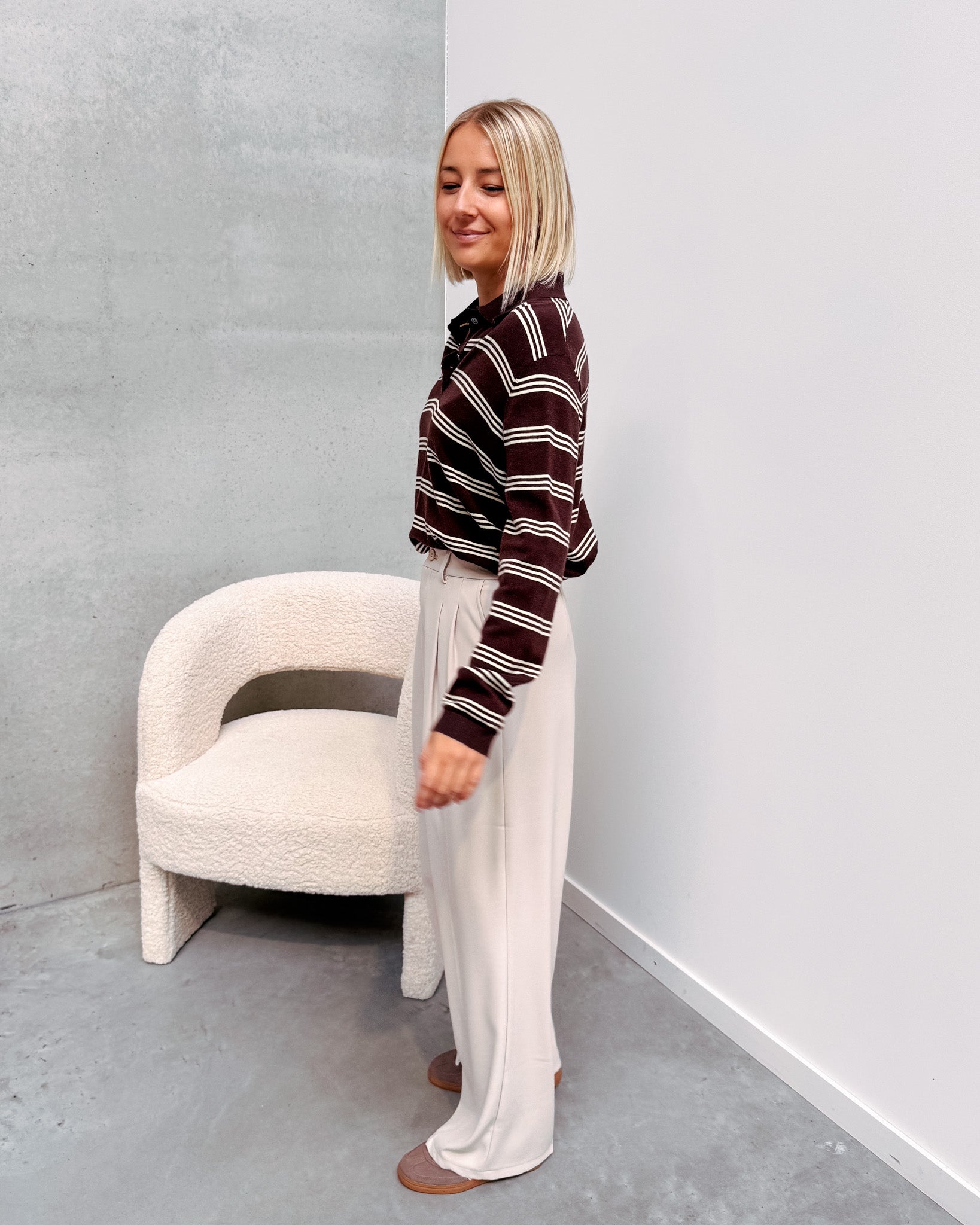 Het polo truitje heeft een dun tricot stofje, deze kan je ideaal nu al dragen. Dit truitje heeft een leuk streepjespatroon met bruin en beige! De trui is afgewerkt met een polo kraagje met knopjes. Het truitje draagt super zacht aan! Alhoewel er wol in zit, prikt deze niet! Wij combineerden de trui met de ‘TAILORED PANT - BEIGE’ samen vormen ze een perfect match! We raden aan de trui met de hand te wassen.