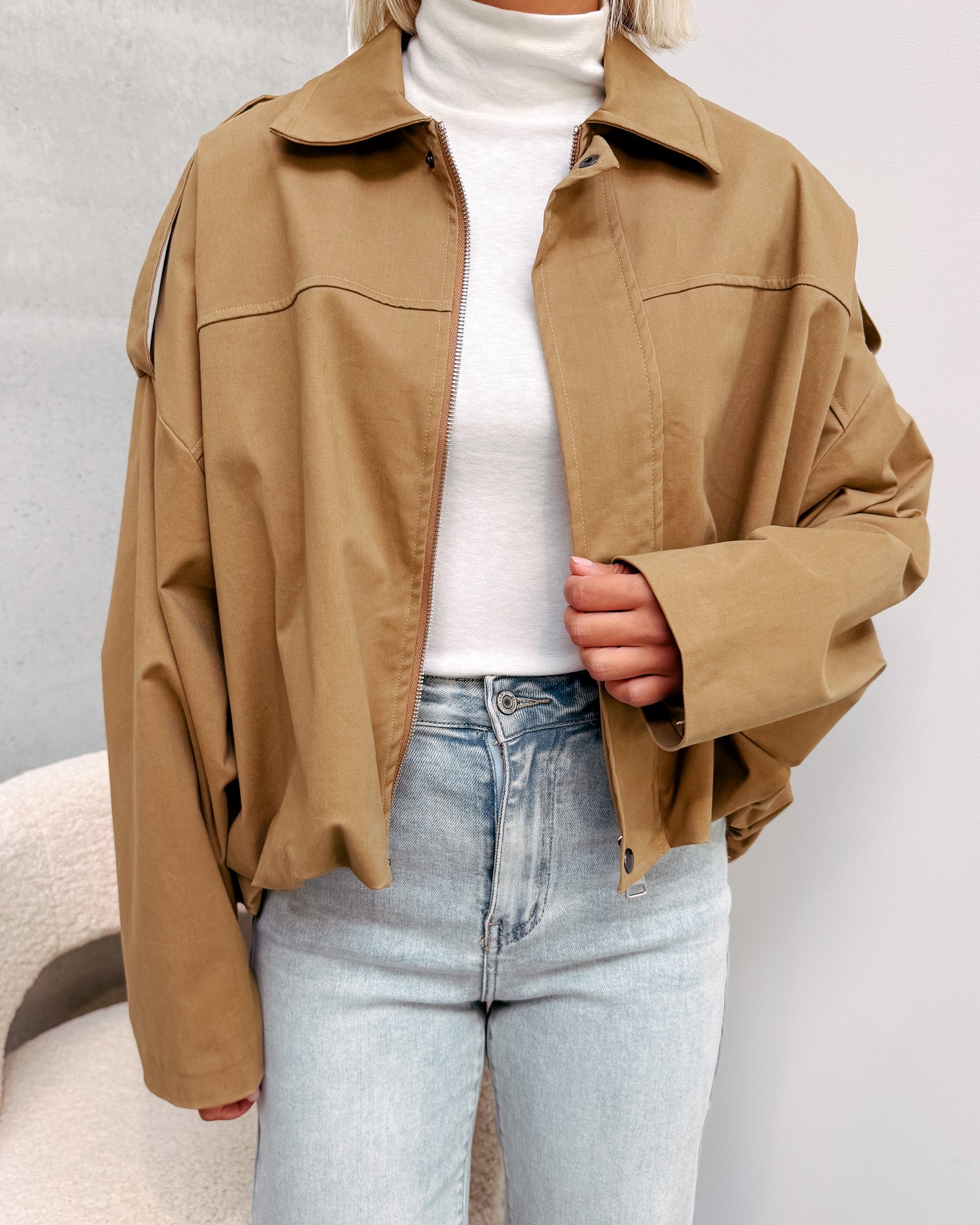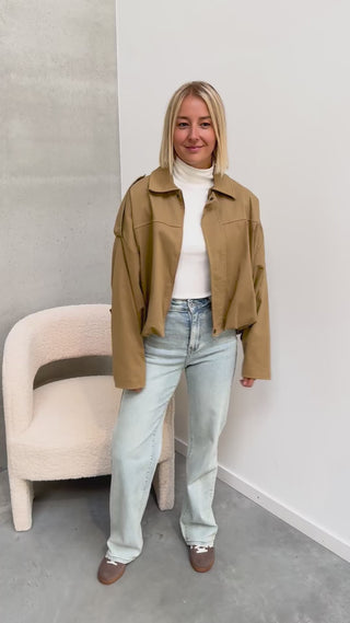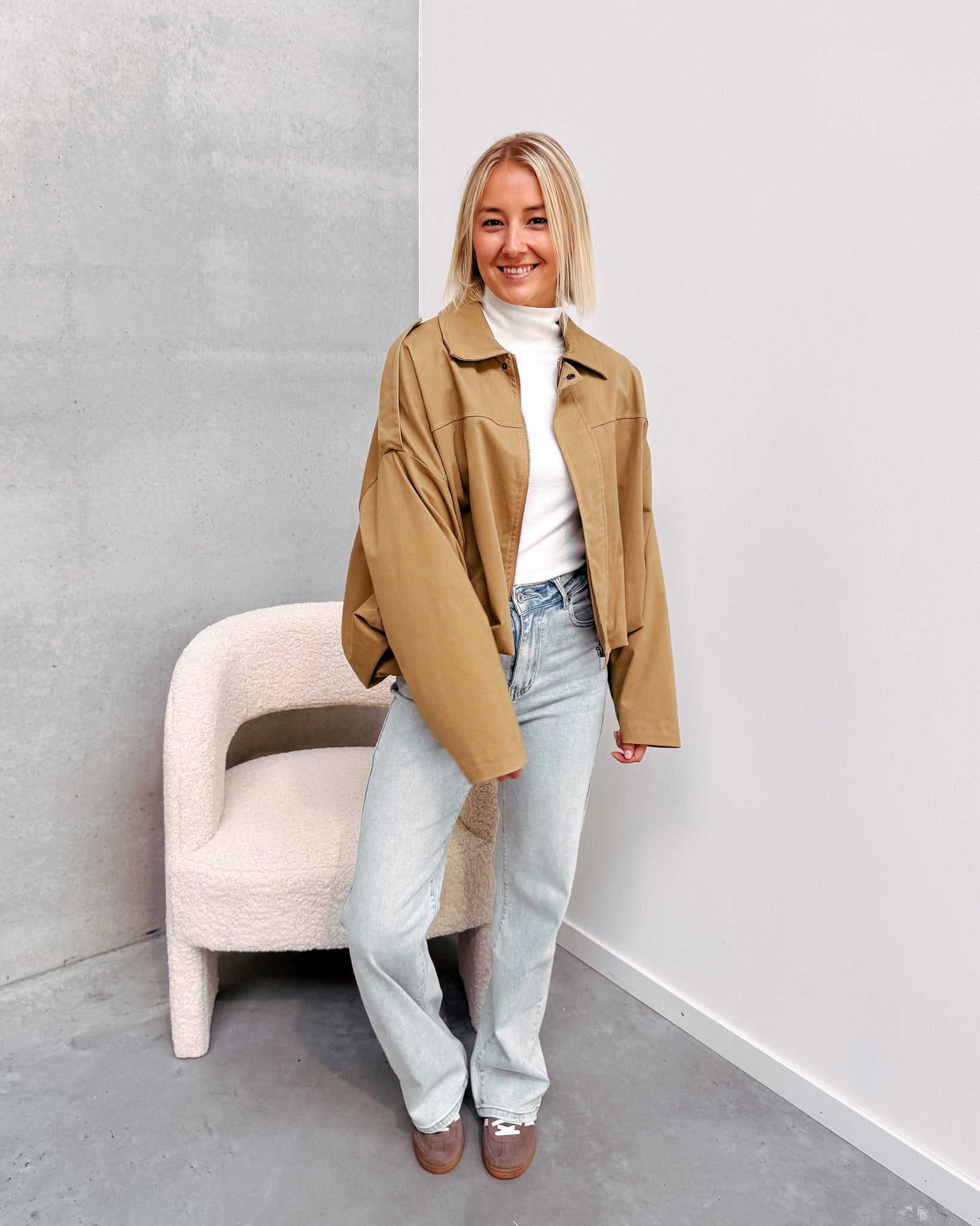 Deze jas is momenteel helemaal on trend. De jas heeft een mooie en dunne trench stof in een camel bruine kleur! De jas heeft een oversized model en valt lekker poofy! Wij combineerden de jas met de ‘JAMIE WIDE JEANS’ en 'SADIE HIGH NECK LONGSLEEVE WHITE' samen vormen ze een perfect geheel!