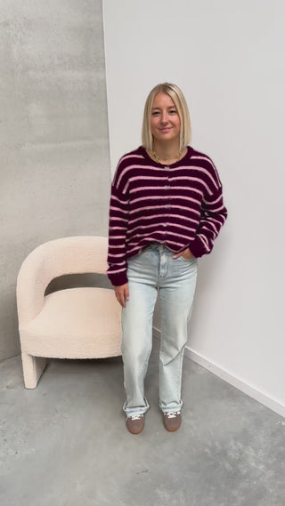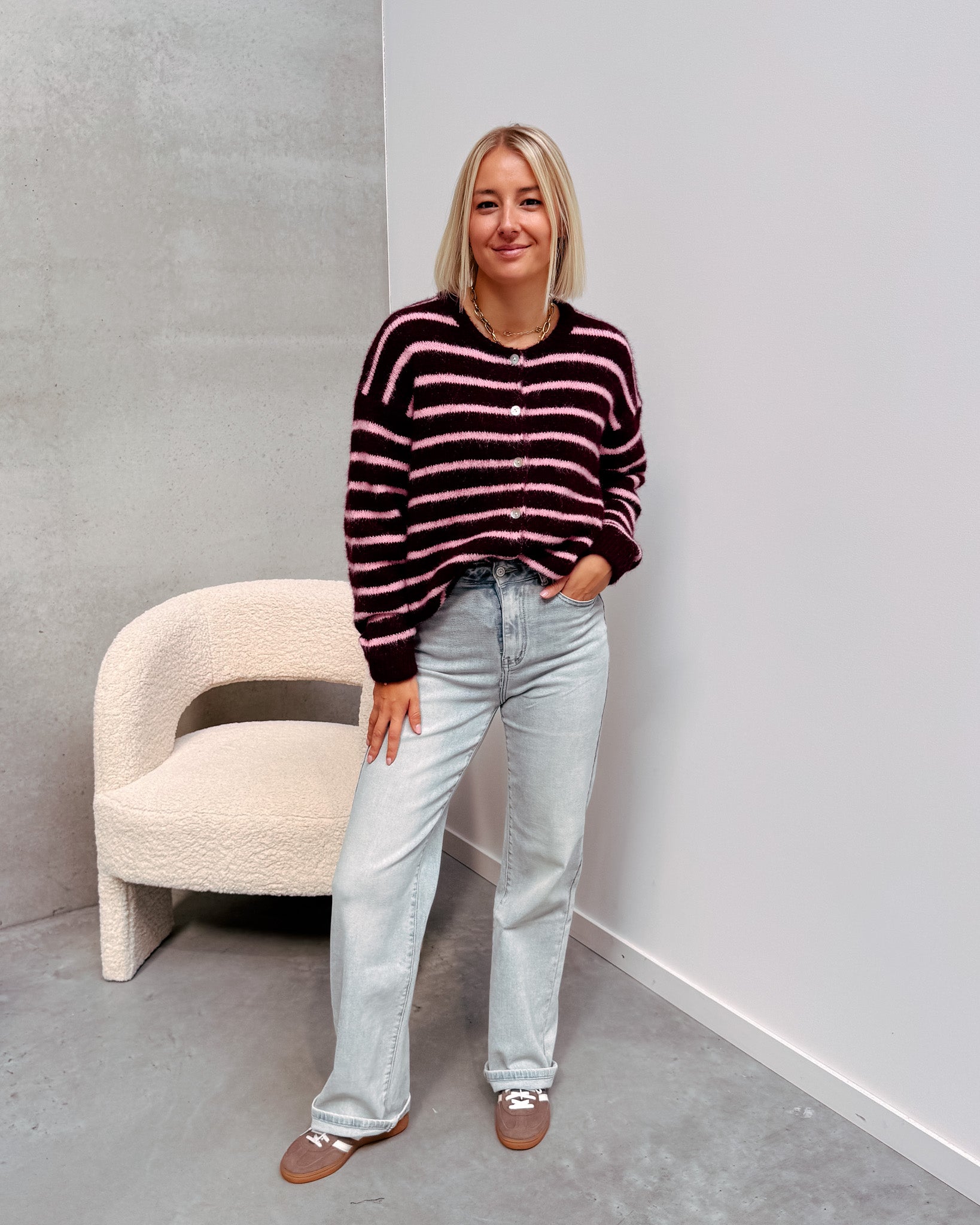 De cardigan sluit met witte knopjes. Je kan deze zowel open dragen als een vestje of gesloten als een truitje. De cardigan draagt super zacht aan! Alhoewel er wol in zit, prikt deze niet! Wij zijn fan van de kleuren combo van licht roze met bordeaux! Wij combineerden de cardigan met de 'JAMIE WIDE JEANS' samen vormen ze een mooi geheel. We raden aan de cardigan met de hand te wassen.