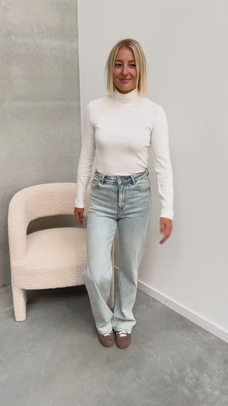 Het truitje heeft een opstaand kraagje. Dit truitje is de ideale basic die je eindeloos kan combineren onder jouw herfst garderobe. Wij combineerden het truitje met de 'JAMIE WIDE JEANS' samen vormen ze een mooi geheel! We raden aan om het truitje met de hand te wassen.
