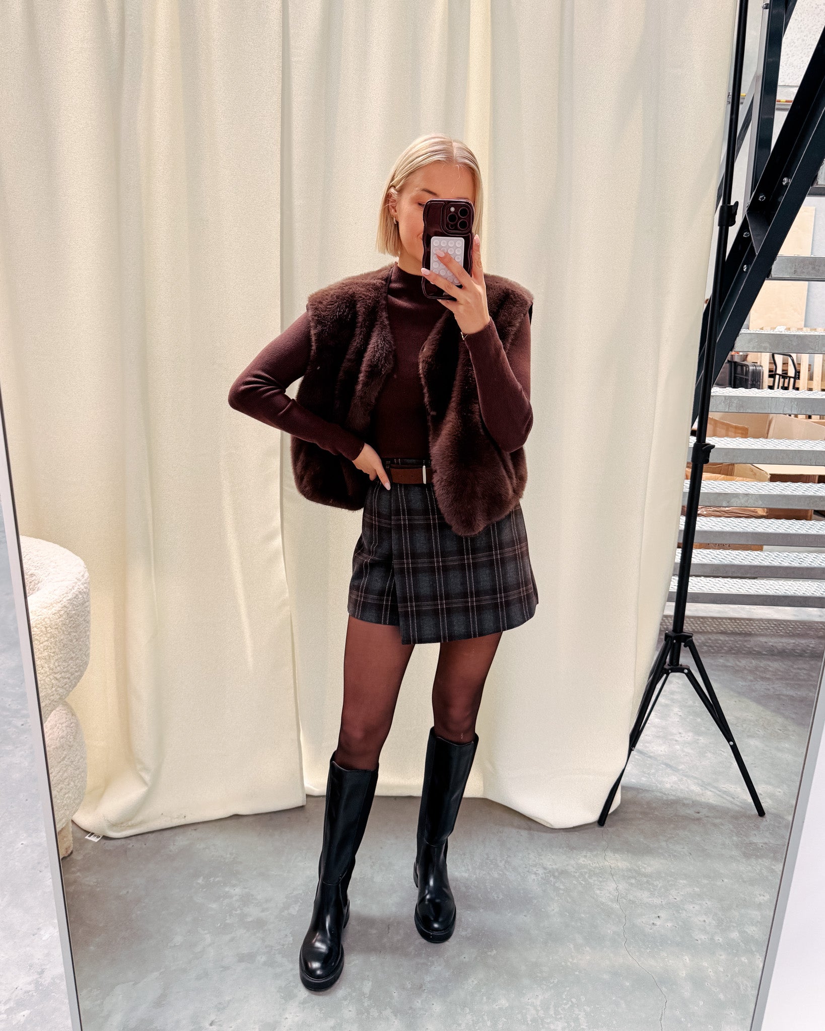 Het truitje heeft een aansluitend model met een opstaand kraagje. Dit truitje heeft een heel zacht stofje in een prachtige chocolade bruine kleur. De naam van de trui zegt het al een beetje, maar deze trui is een tijdloze basic die je eindeloos kan combineren met jouw garderobe. Wij combineerden de trui met de 'AMELIE TARTAN SKORT' en 'PERFECT BLACK PANTY' samen vormen ze een perfect match! We raden aan het truitje met de hand te wassen. Style deze outfit as a total look met onze 'FARAH FUZZY GILET - BROWN'!