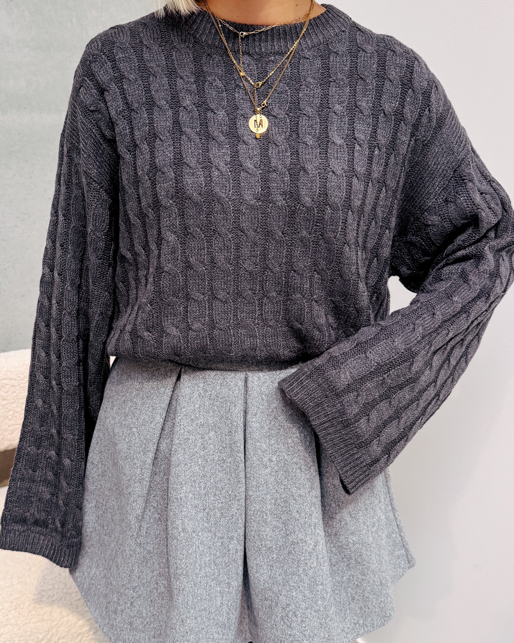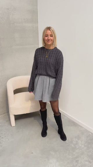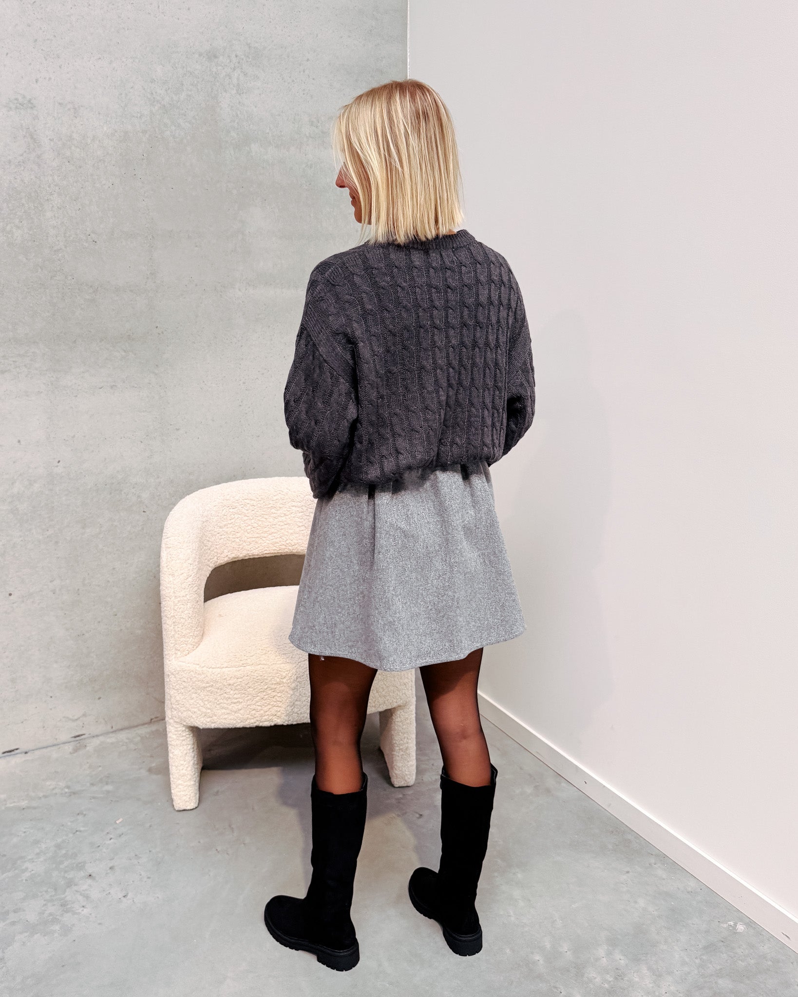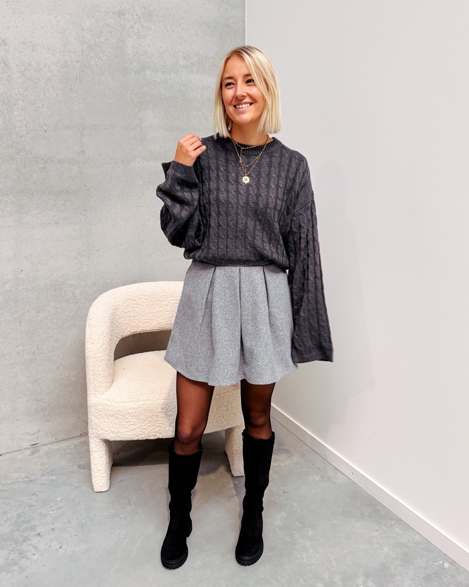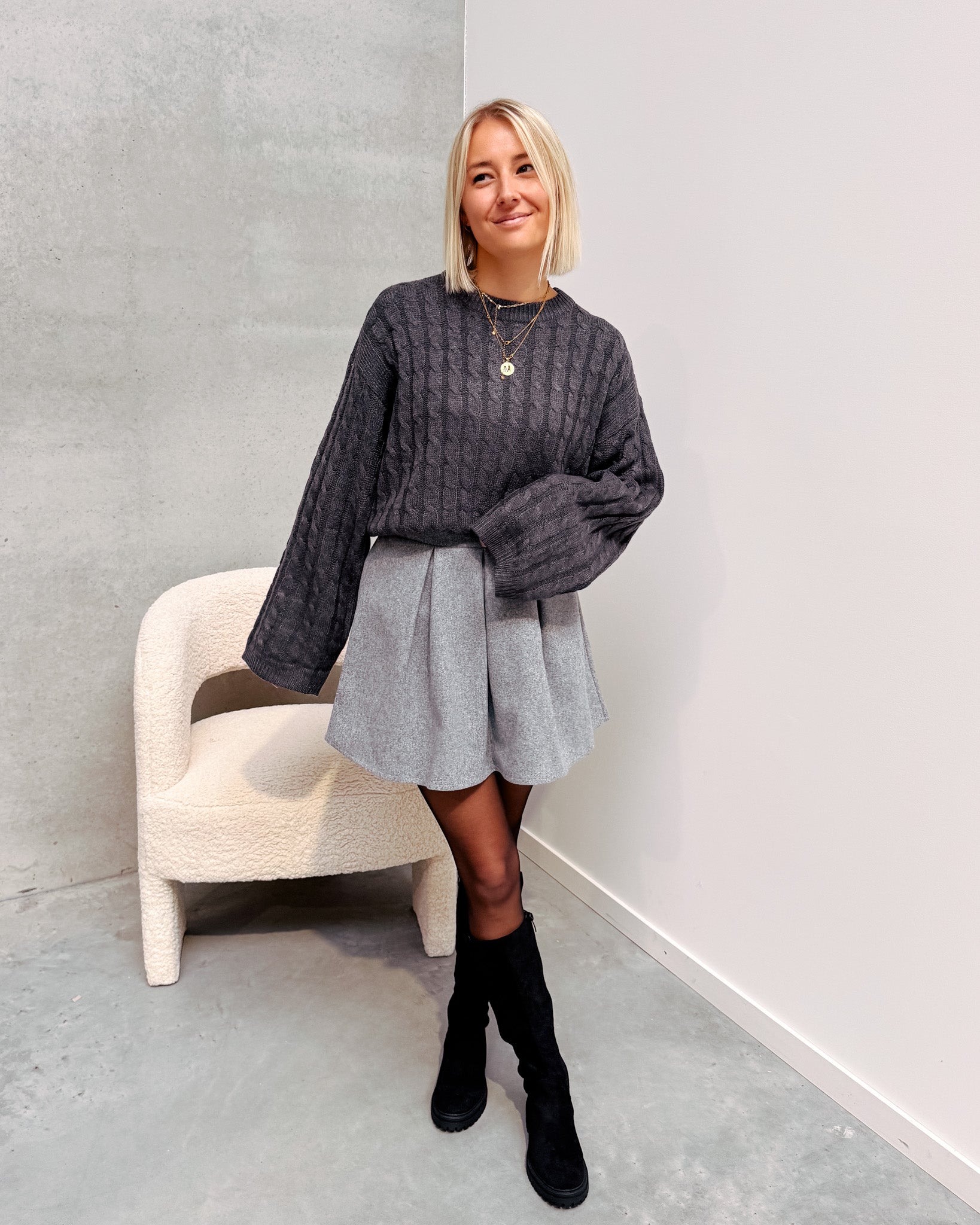 De trui heeft een tof kabel motief! Deze trui valt iets langer en heeft een los model. Het truitje heeft brede mouwen en draagt heel zacht aan! Wij combineerden de trui met de ‘HILDA SKIRT - GREY MELANGE’, de ‘RUE HIGH BOOTS - BLACK’ en de 'PERFECT BLACK PANTY' samen vormen ze een perfect match!