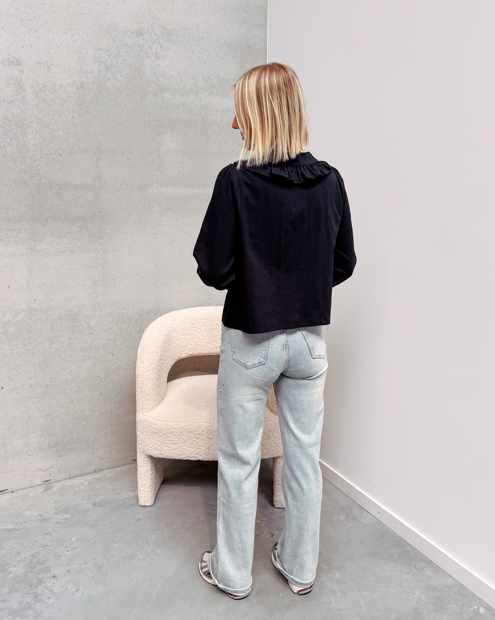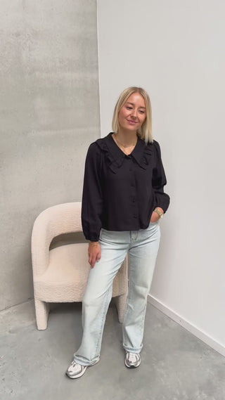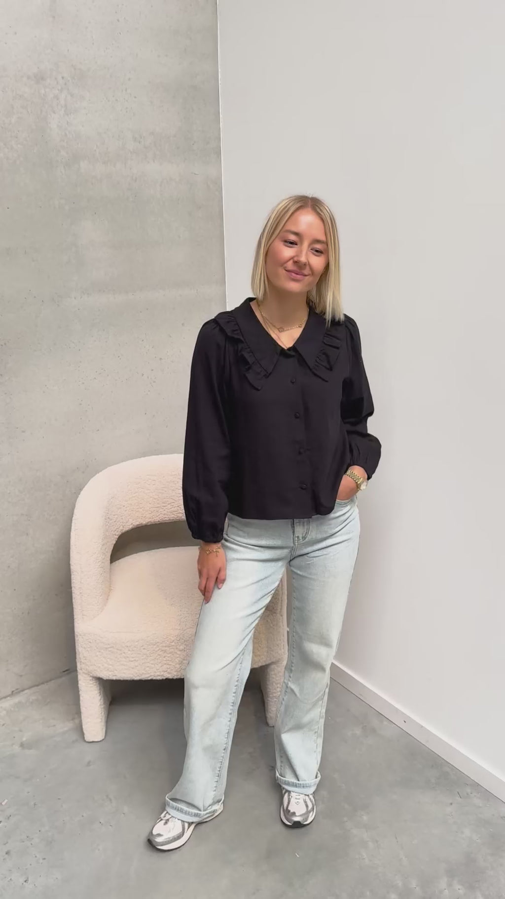 De blouse heeft een super schattig kraagje en sluit met knopjes. Deze blouse heeft een normale lengte. De mouwen van de blouse hebben een elastiek. Wij combineerden de blouse met de ‘JAMIE WIDE JEANS' samen vormen ze een mooi geheel. We raden aan de blouse met de hand te wassen.