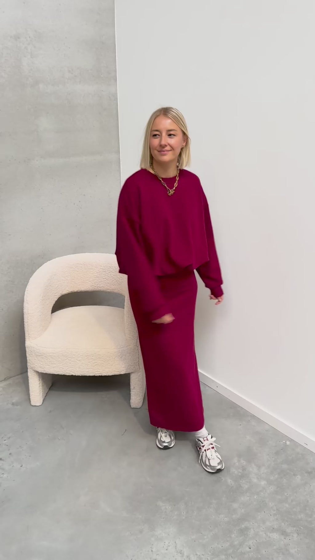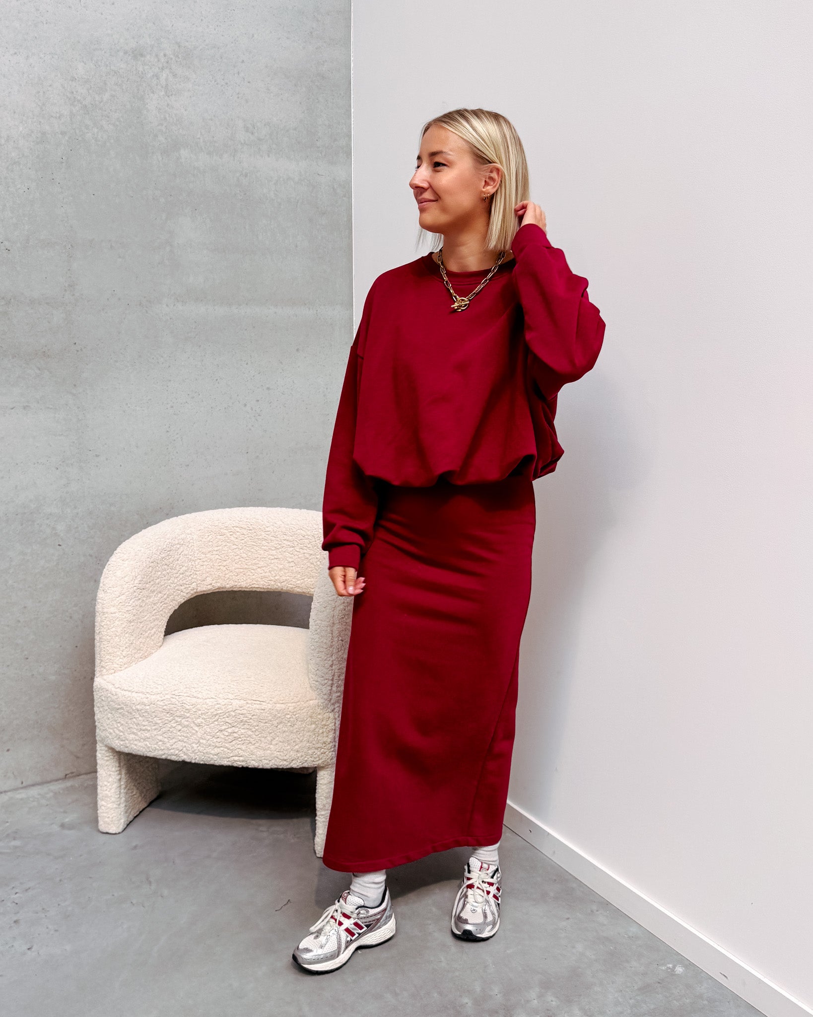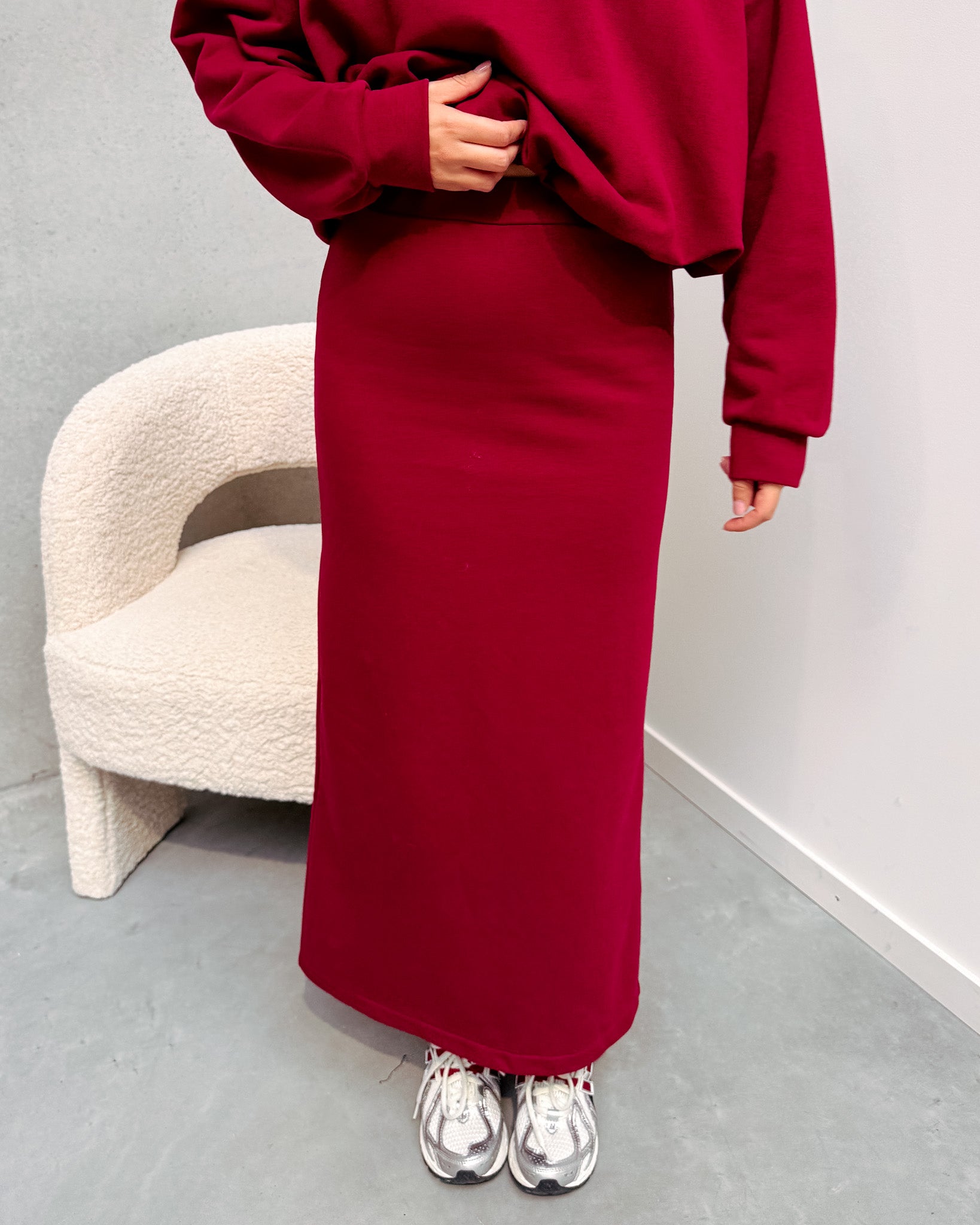 De rok heeft bovenaan een elastische band en zit heel comfortabel aan. Achteraan heeft de rok een split, deze geeft het een leuk detail! Je zou de rok ook kunnen omdraaien en zo dragen dat de split vooraan zit. Wij combineerden de rok met de matching ‘NIKKI BALLOON SWEATER - BURGUNDY’ samen vormen ze een mooi geheel! Je kan de rok zeker ook combineren met een toffe blouse/shirt!