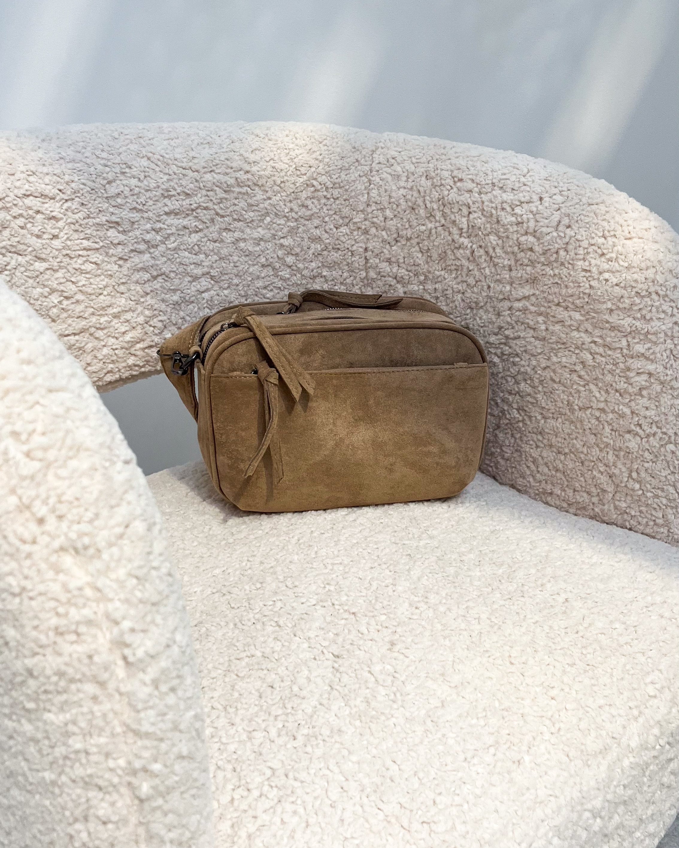 De tas heeft een hele mooie suede stof. Deze tas heeft 2 grote ritsen met 2 vakken waar je heel wat bag essentials kan in opbergen! Ook heeft de tas nog 2 kleine vakjes met een rits. Je kan de tas zowel crossbody dragen met de verstelbare riem, of als schoudertas.