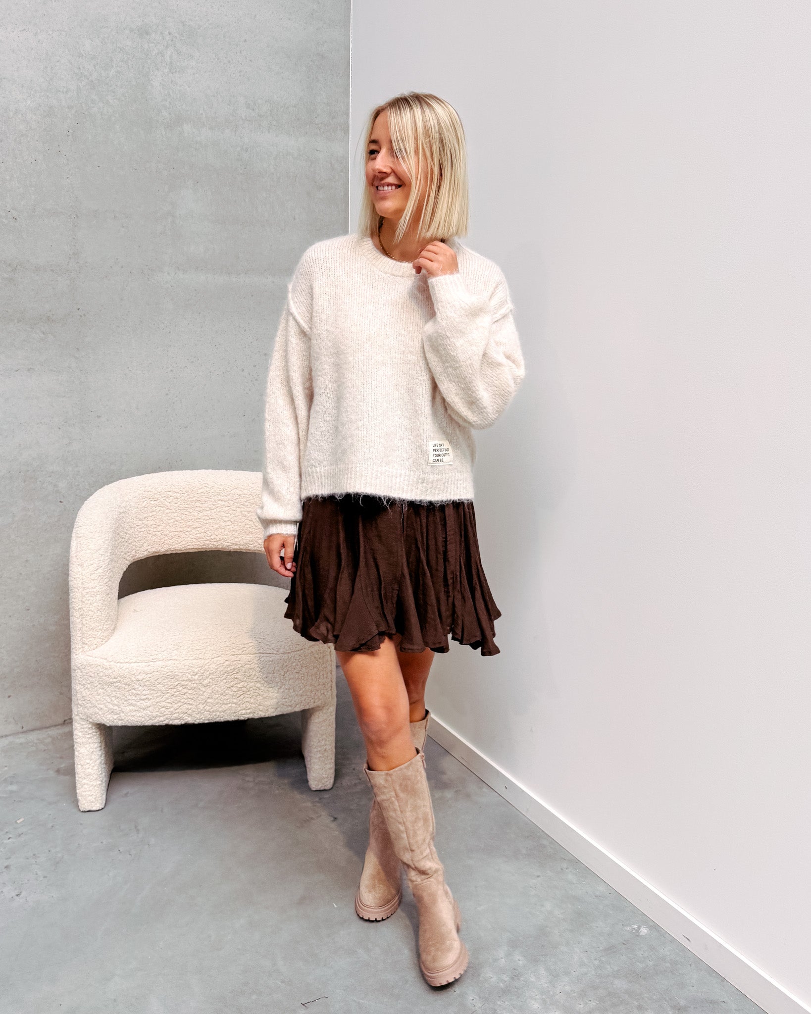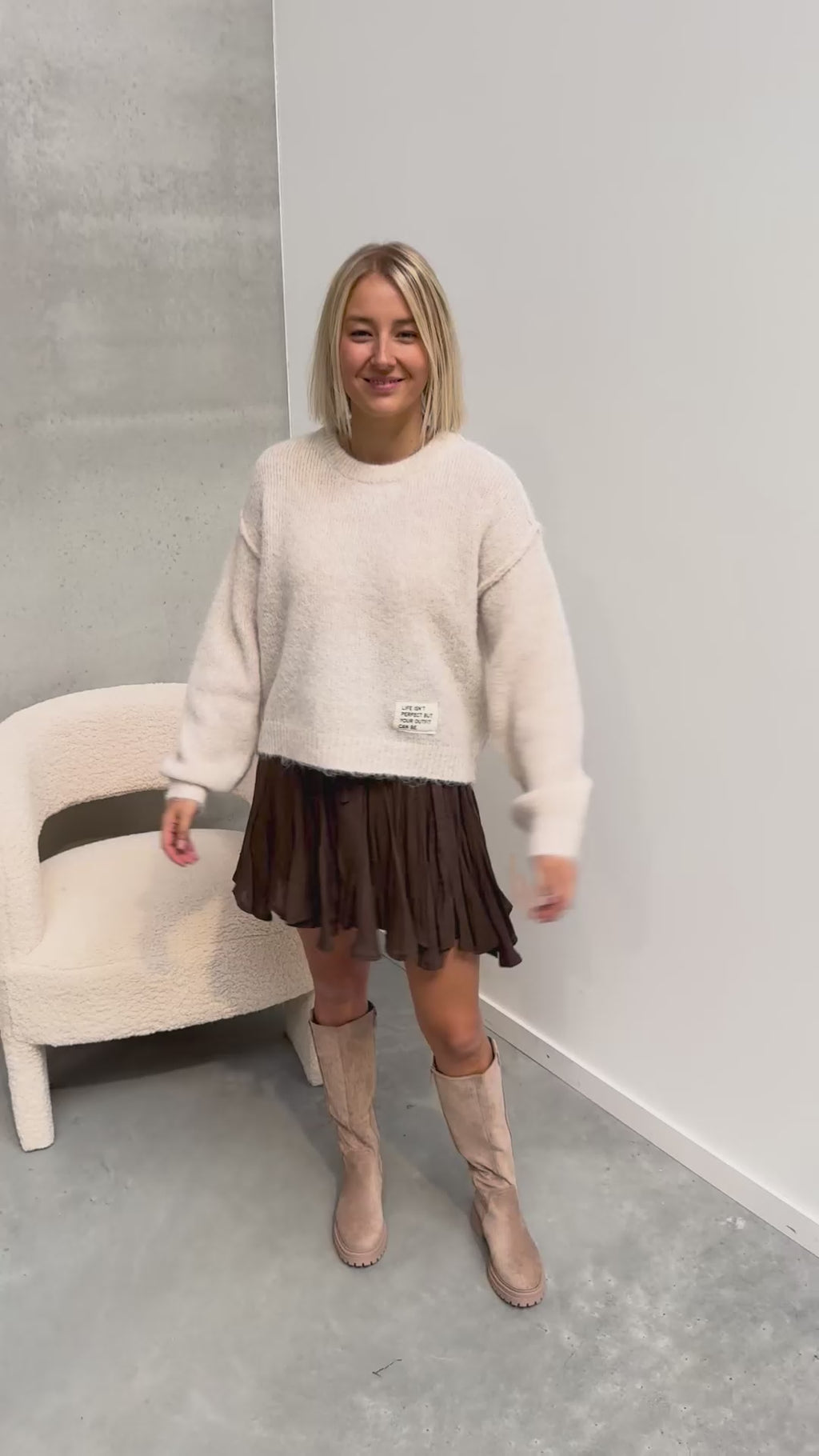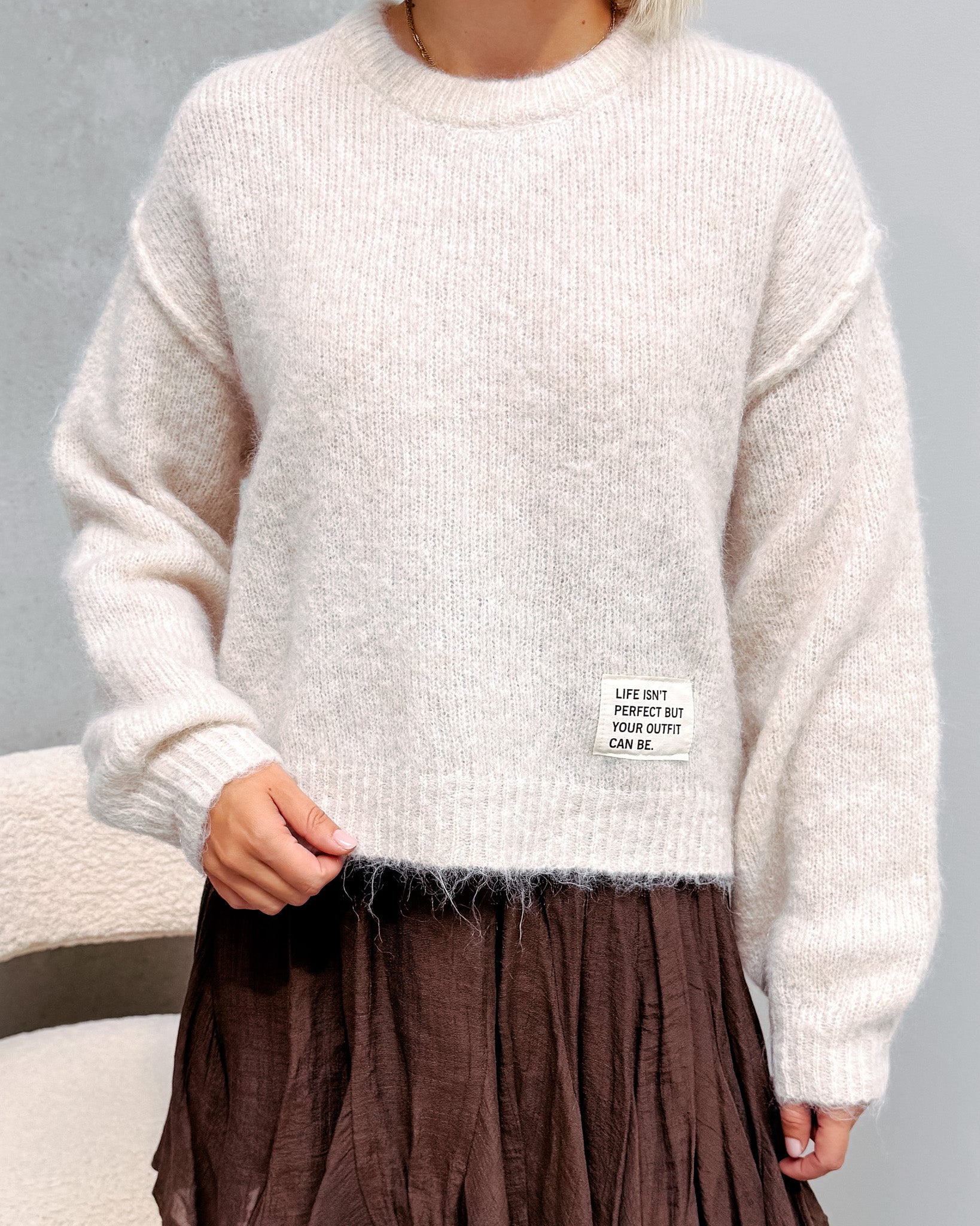 De trui heeft een los modelletje! Op de trui staat de tekst ‘Life isn’t perfect but your outfit can be’ deze geeft het een leuk detail! Ook is de trui afgewerkt met een naad aan de schouders, deze geeft het ook een extra touch! Er zit wol in de trui, als je hier gevoelig aan bent kan dit wel een prikkend gevoel geven. Wij combineerden de trui met de ‘ALICE BROWN SKIRT’ en ‘RUE HIGH BOOTS - BEIGE’ samen vormen ze een perfect geheel! We raden aan de trui met de hand te wassen.