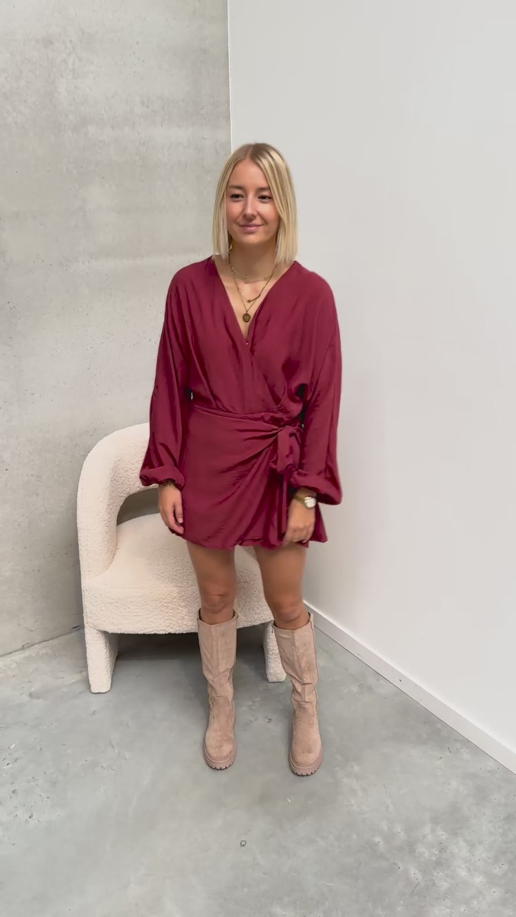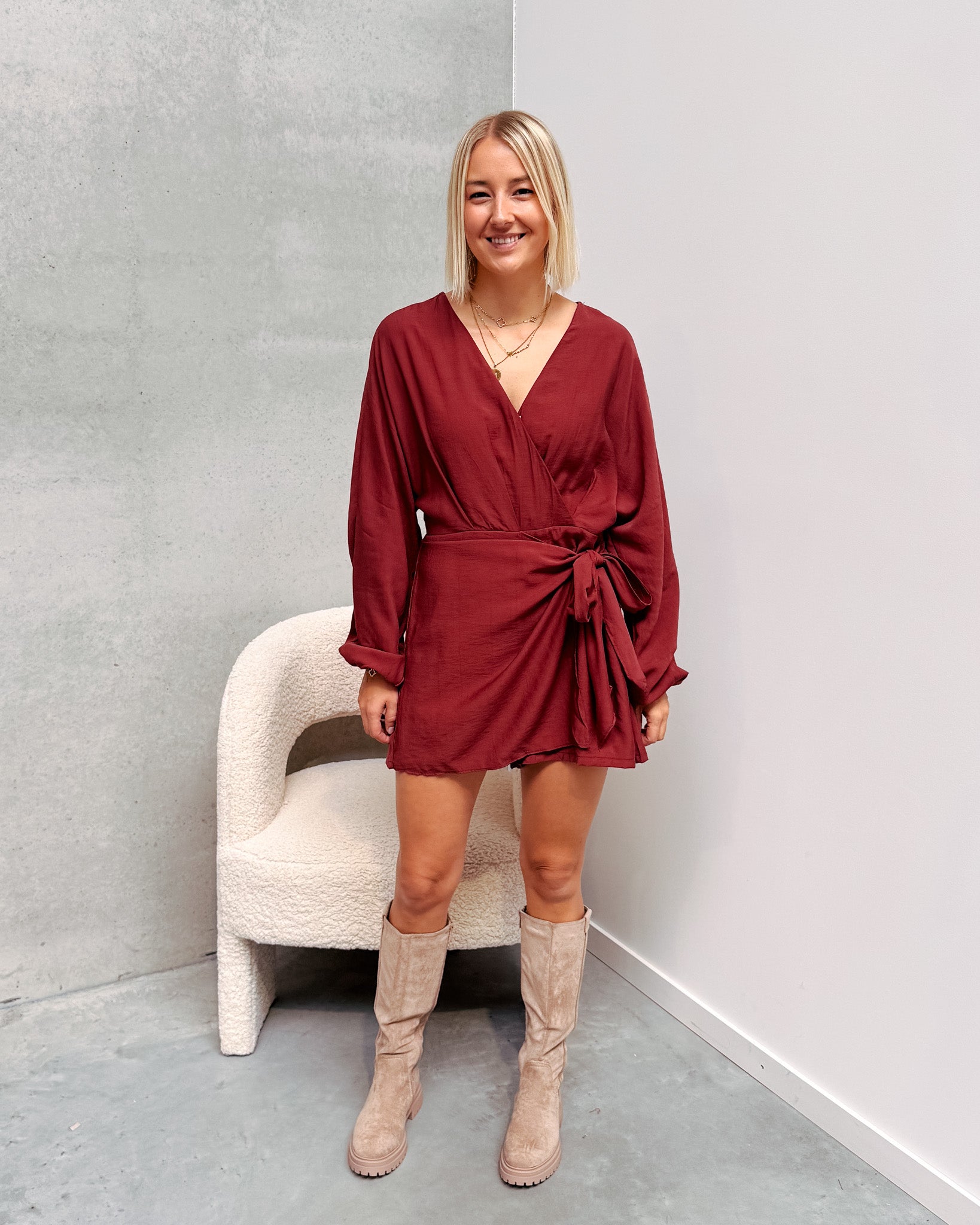 Het lijkt een overslag jurkje maar het is eigenlijk een playsuit met een short. De playsuit heeft een v-hals met een drukknopje, zo is er niets zichtbaar. Ook heeft het vooraan op de taille een overslag detail dat je kan knopen. De playsuit heeft een dun stofje, het shortje is dubbel gevoerd. Deze kan je ideaal zo dragen of met een panty eronder. Deze playsuit kan perfect gedragen worden voor de aankomende feestdagen. Wij combineerden de playsuit met de ‘RUE HIGH BOOTS - BEIGE’ samen vormen ze een perfect match!