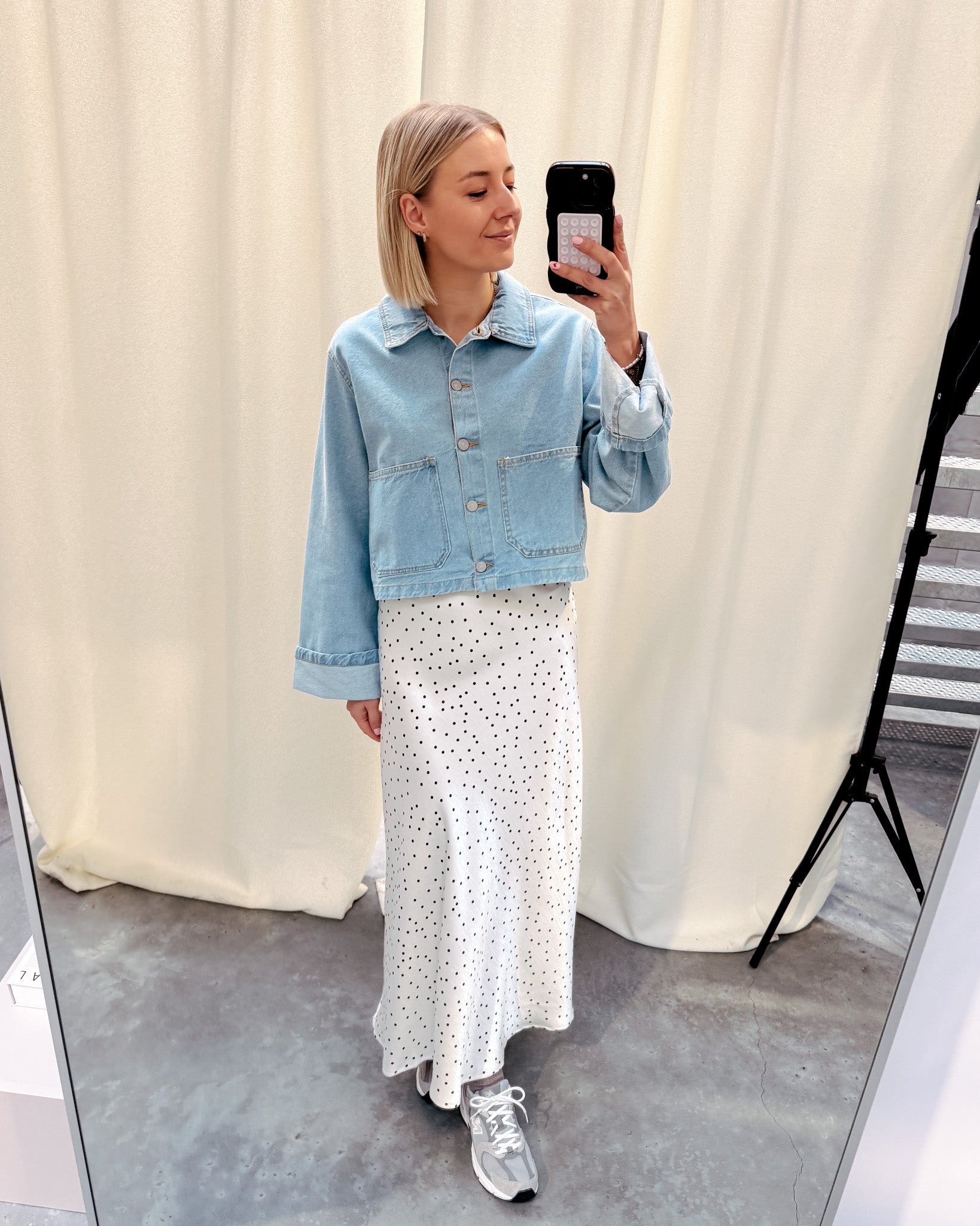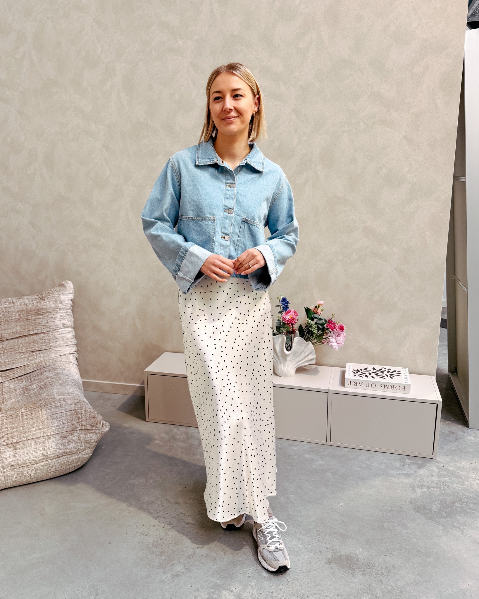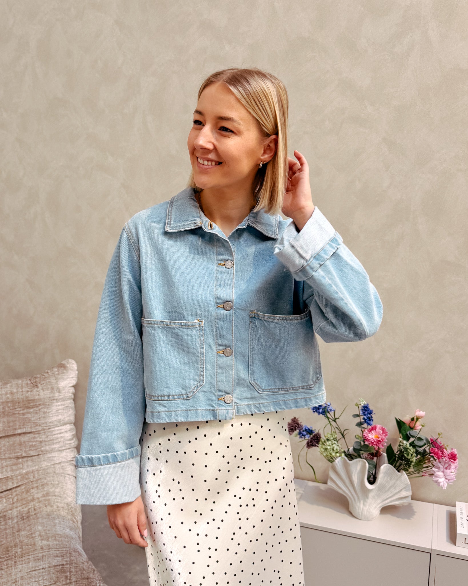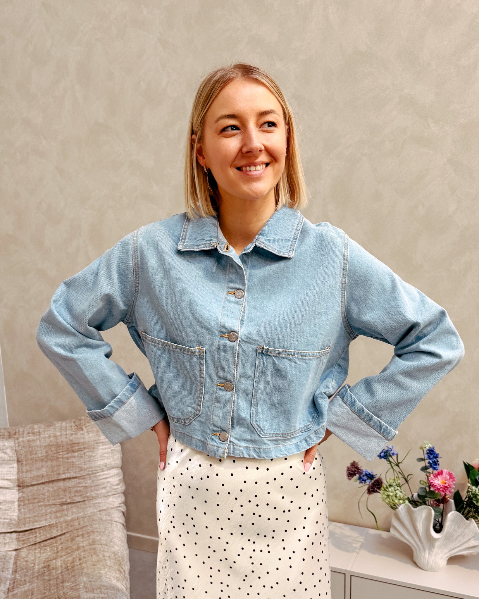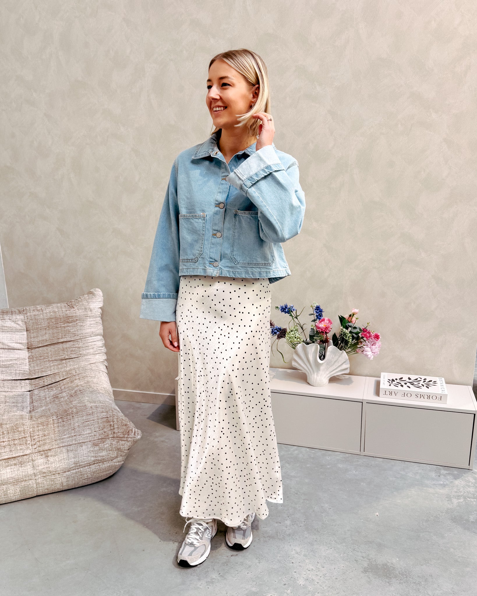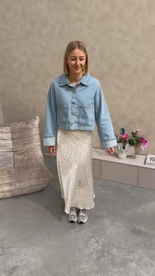De blouse heeft een kort model en sluit met knopjes. Wij combineerden de blouse met de ‘LEONIE POLKA DOT SKIRT’ samen vormen ze een prachtig geheel.