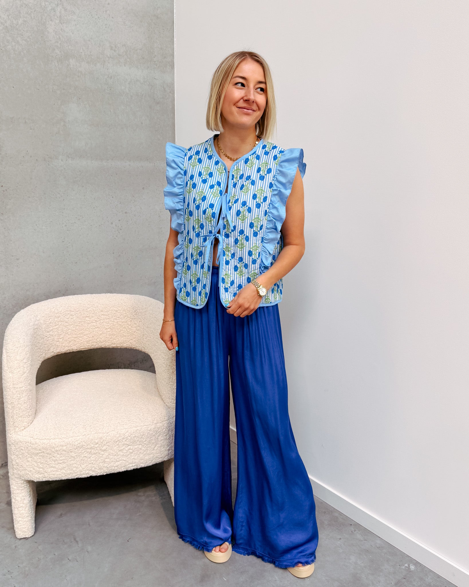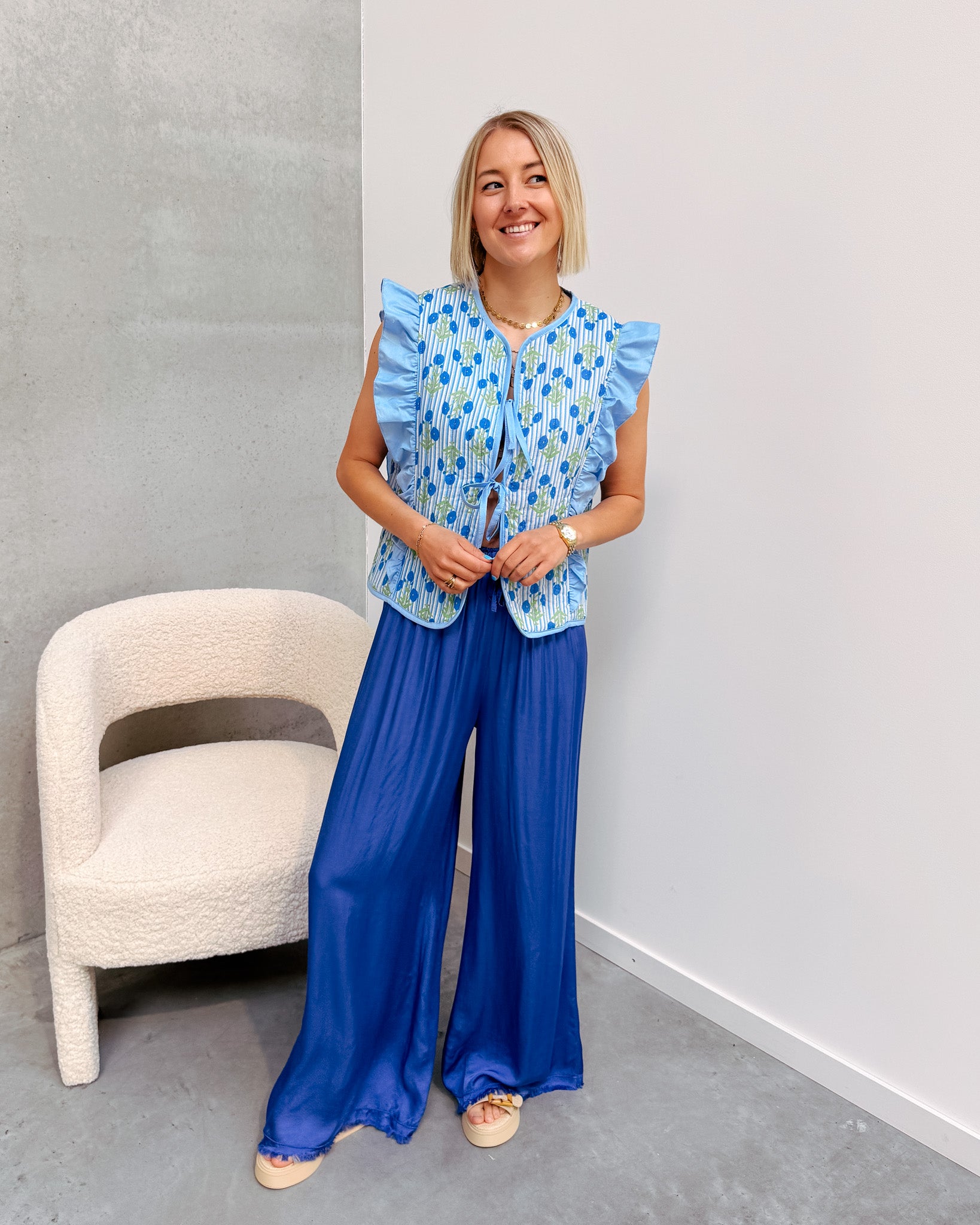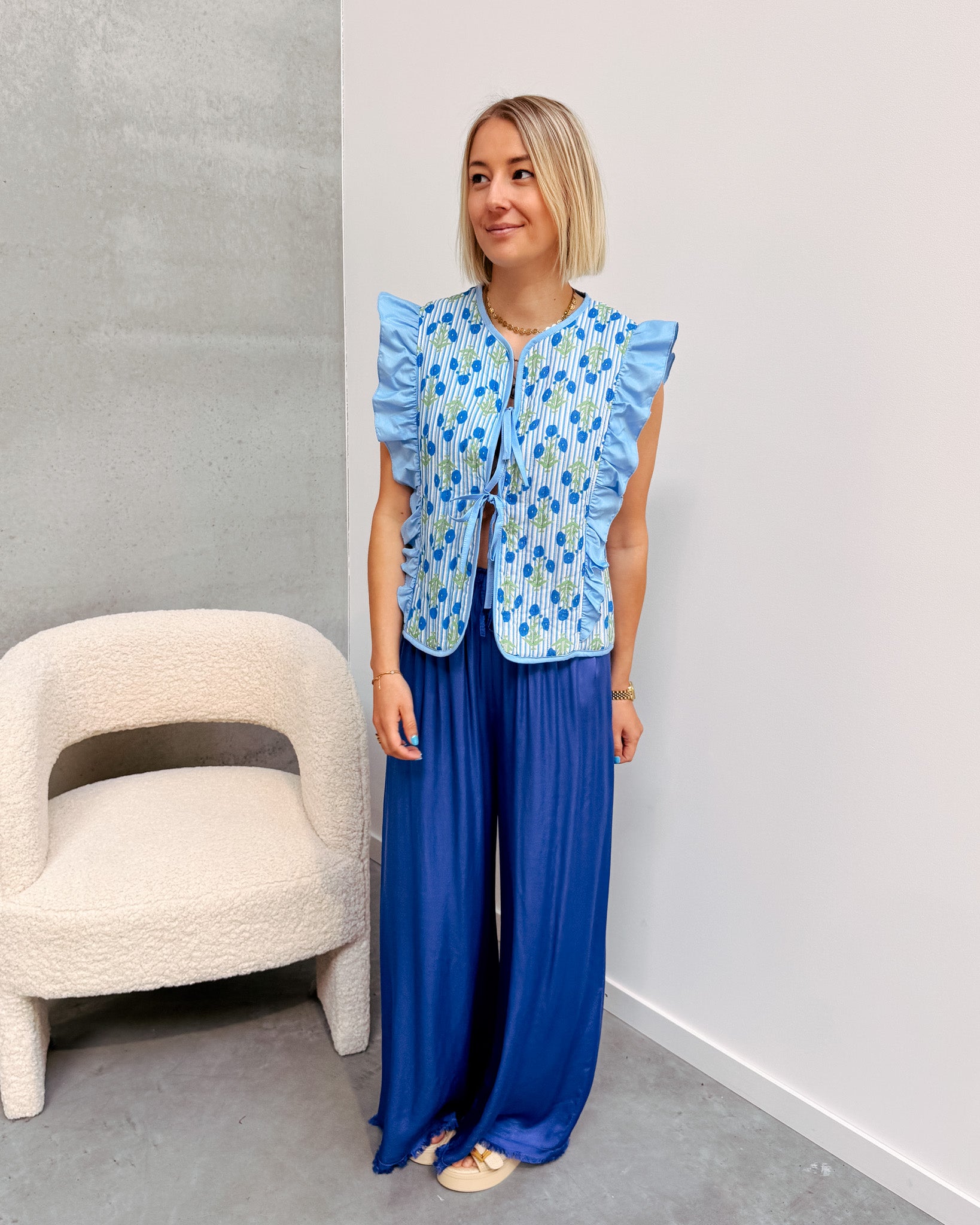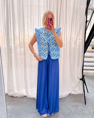 De gilet sluit vooraan met 2 strikjes, ook heeft deze een schattig ruffle detail! Je kan deze gilet combineren met een wit topje of T-shirt eronder. Deze gilet heeft ook een heel mooi bloemen printje! Wij combineerden de gilet met de 'MARIE SILK PANT - COBALT BLUE' en 'BALI SLIPPERS - APRICOT' samen vormen ze een top combo!