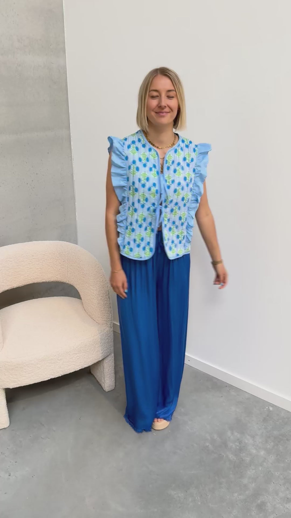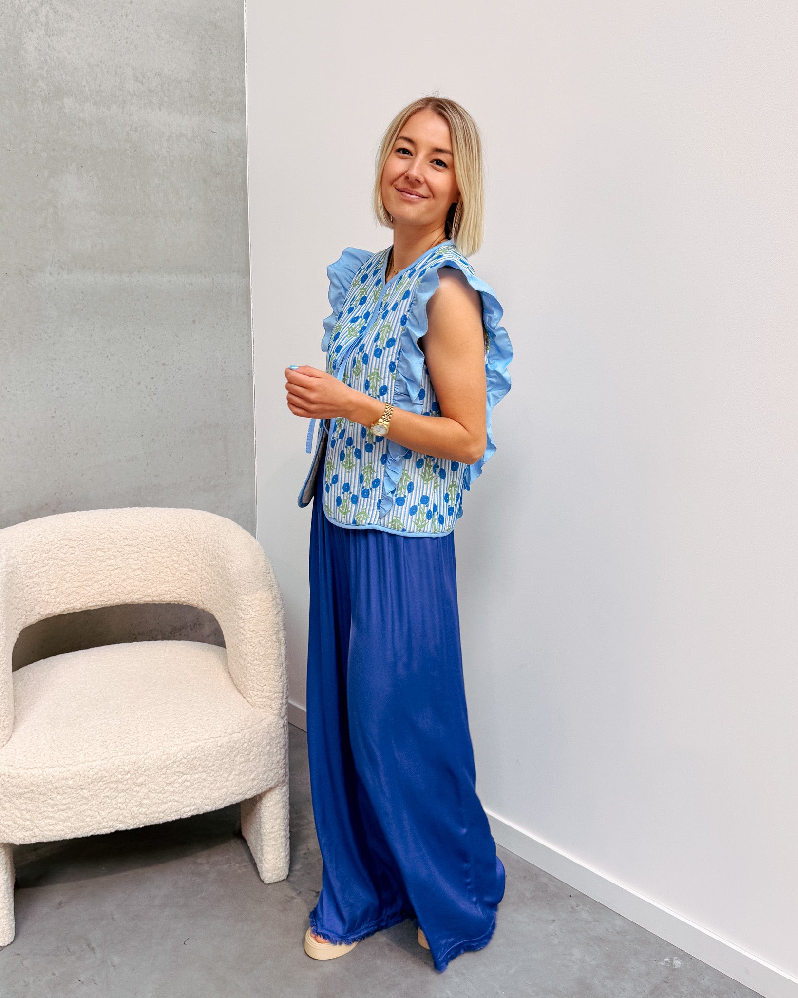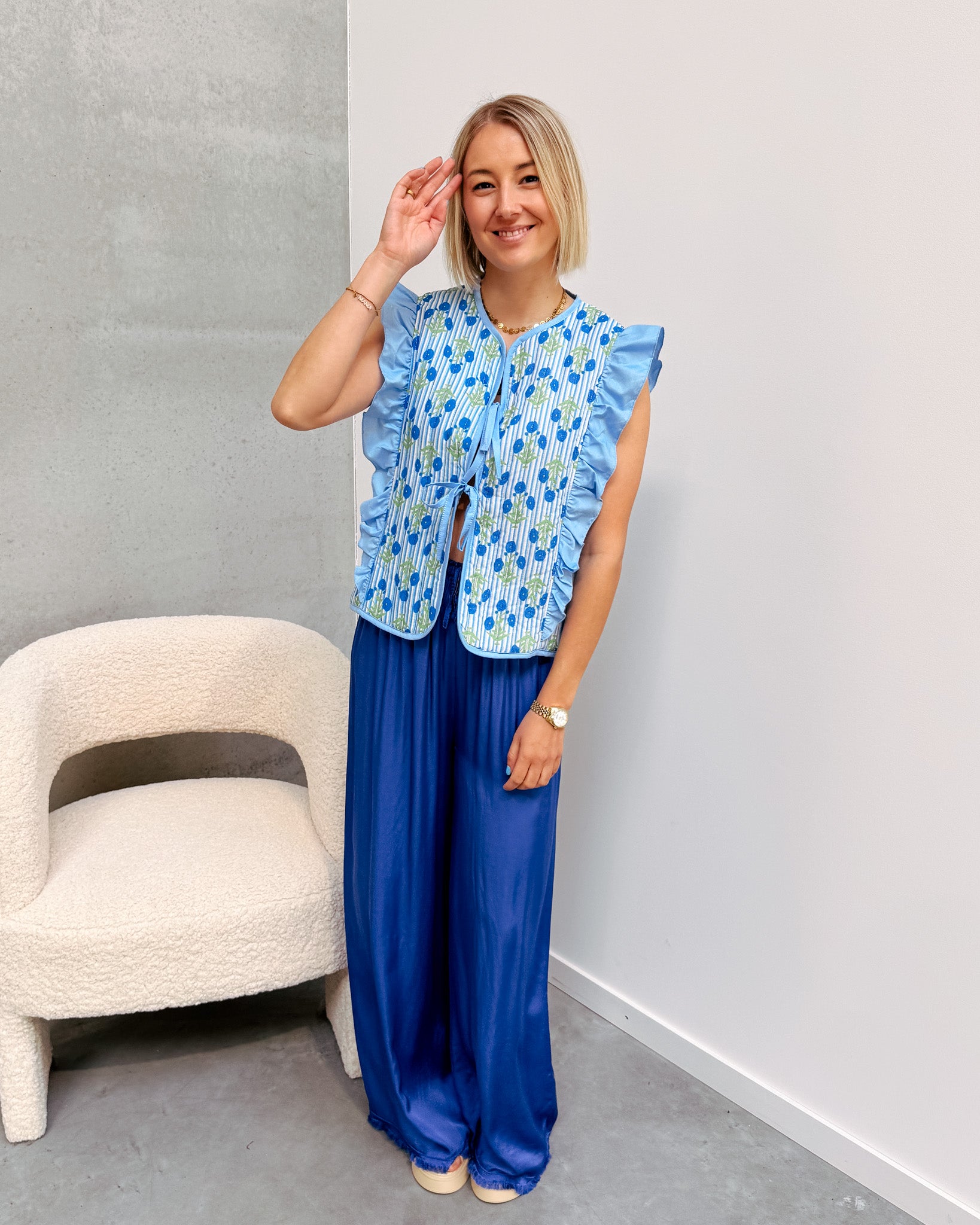 De gilet sluit vooraan met 2 strikjes, ook heeft deze een schattig ruffle detail! Je kan deze gilet combineren met een wit topje of T-shirt eronder. Deze gilet heeft ook een heel mooi bloemen printje! Wij combineerden de gilet met de 'MARIE SILK PANT - COBALT BLUE' en 'BALI SLIPPERS - APRICOT' samen vormen ze een top combo!