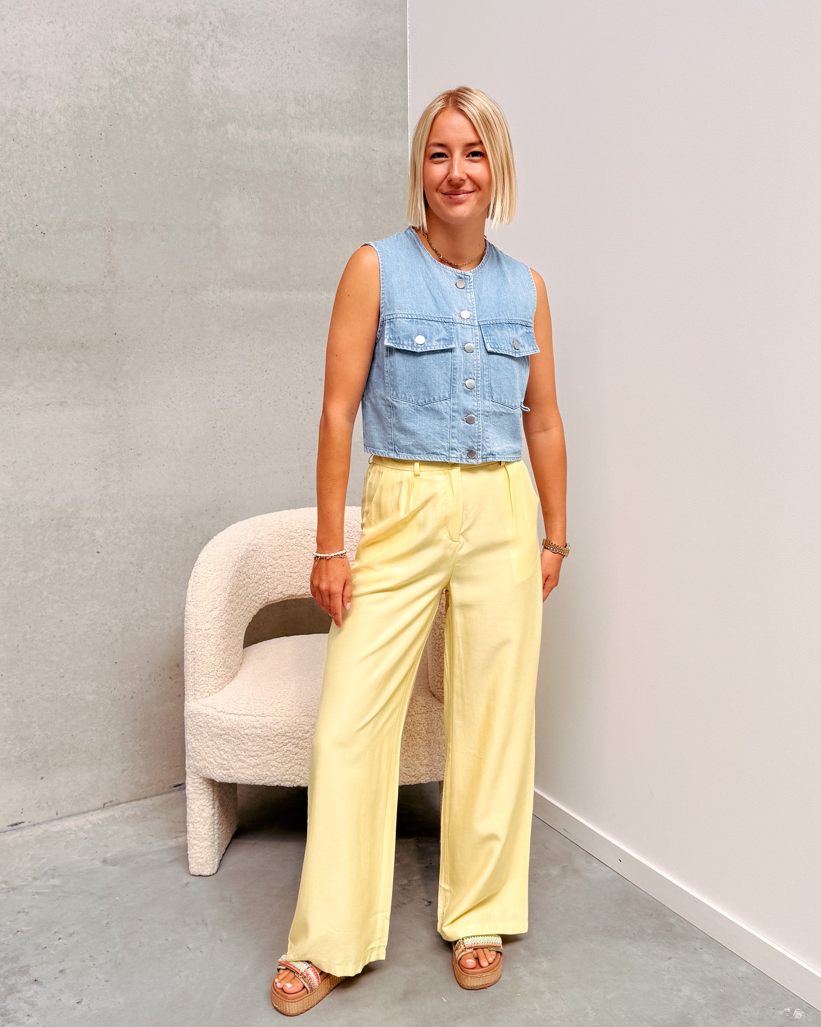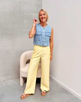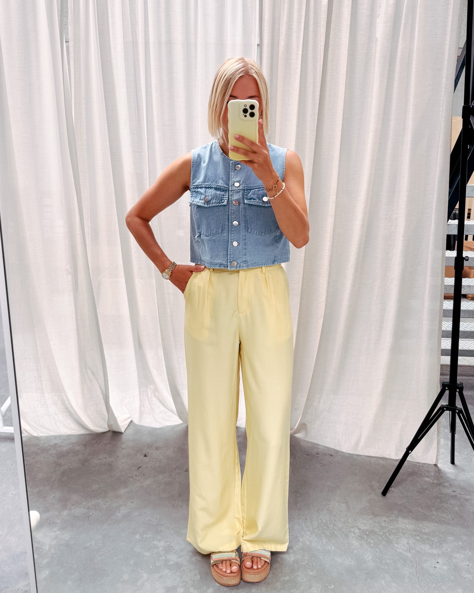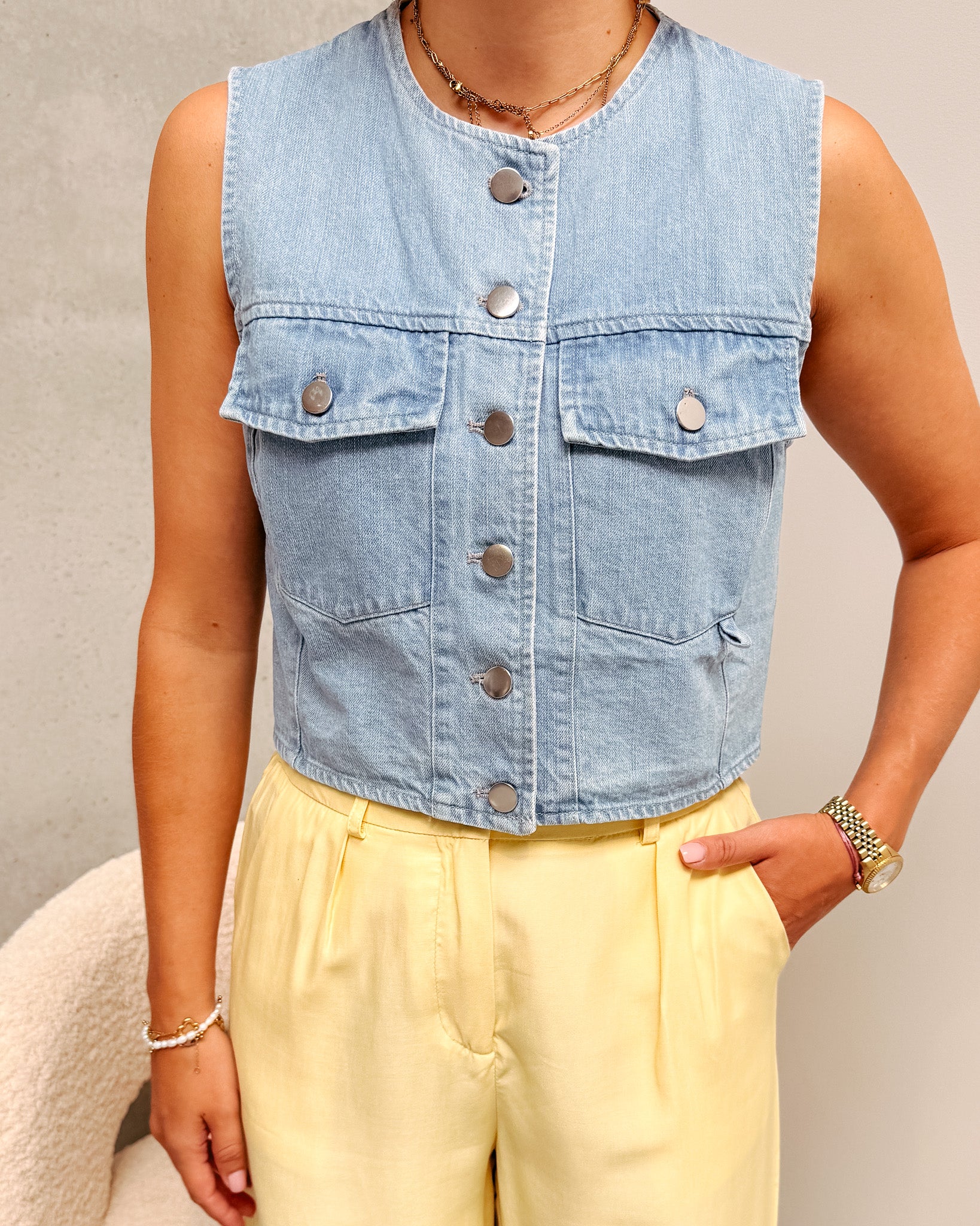 De top is eigenlijk een mouwloze gilet die sluit met knoppen. De gilet heeft vooraan 2 zakjes deze geven het een leuk detail! Ook valt de gilet iets korter, deze kan je ideaal dragen op een hoge taille broek/rok. Wij combineerden de gilet met de 'AUDREY CLASSIC PANT - YELLOW' en 'COCO CHUNKY SANDALS - MULTICOLOR' samen vormen ze een perfect geheel! We raden aan de gilet met de hand te wassen.