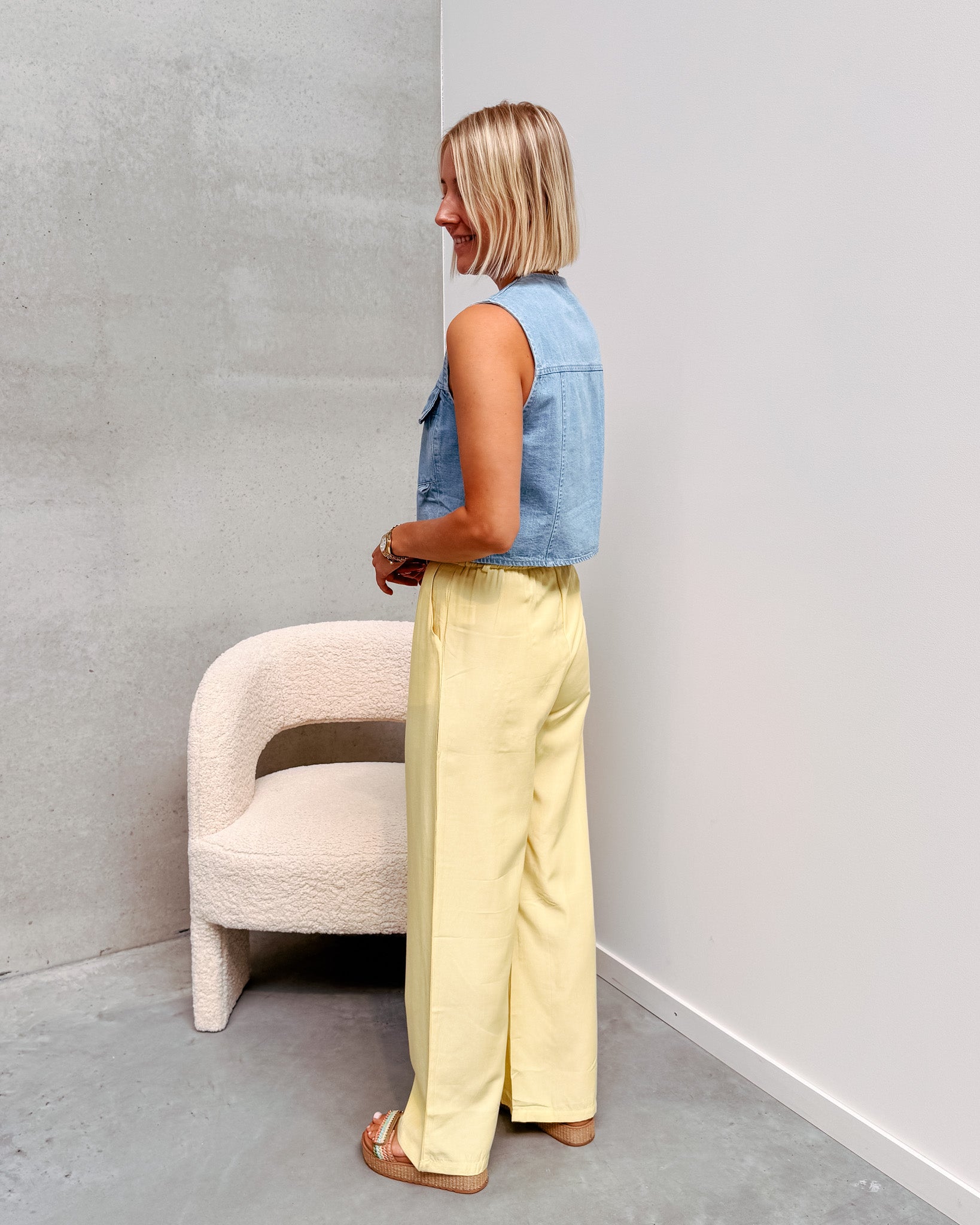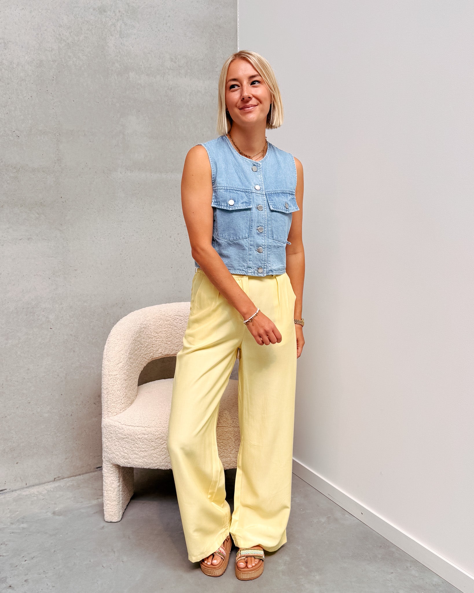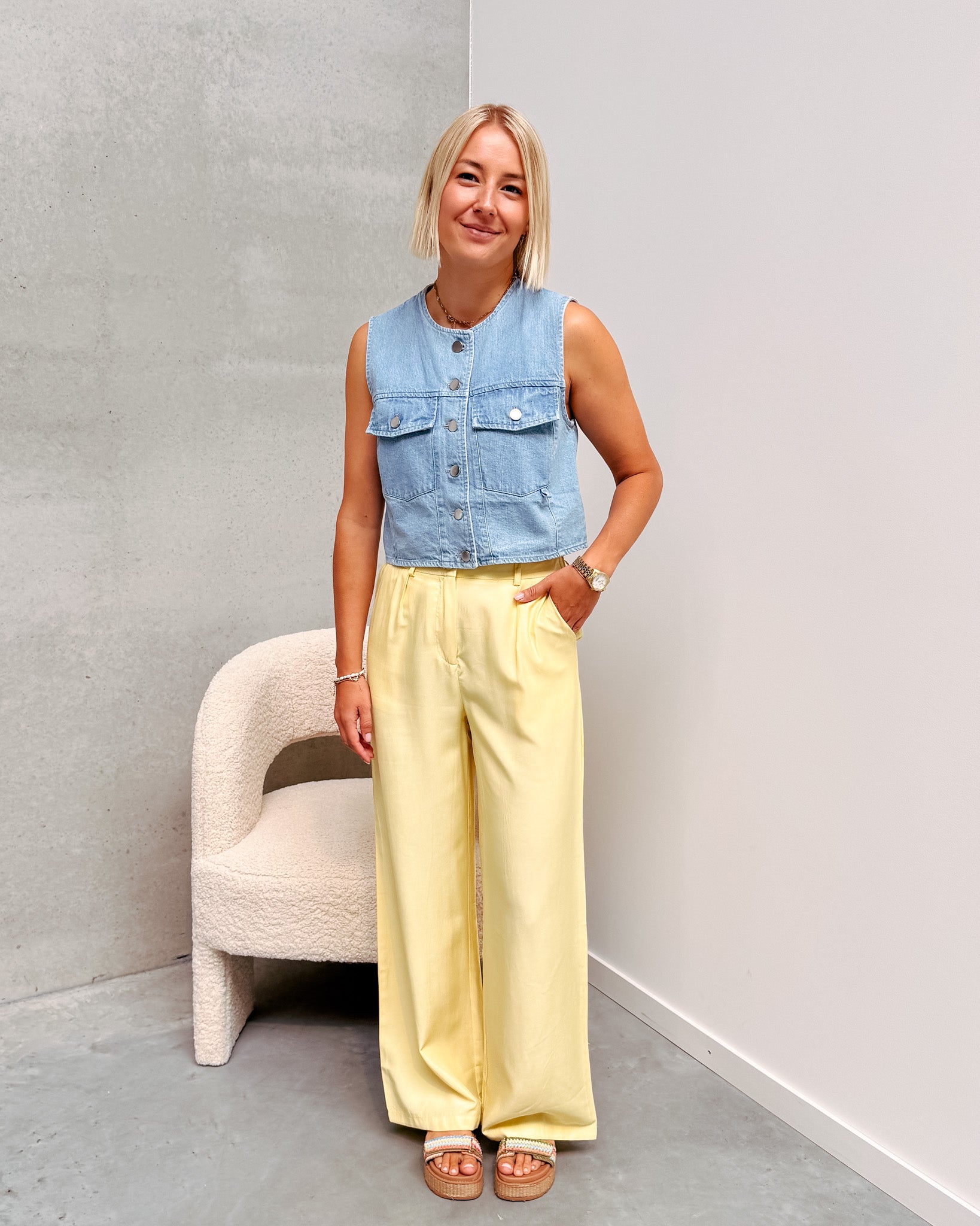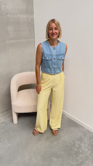 De top is eigenlijk een mouwloze gilet die sluit met knoppen. De gilet heeft vooraan 2 zakjes deze geven het een leuk detail! Ook valt de gilet iets korter, deze kan je ideaal dragen op een hoge taille broek/rok. Wij combineerden de gilet met de 'AUDREY CLASSIC PANT - YELLOW' en 'COCO CHUNKY SANDALS - MULTICOLOR' samen vormen ze een perfect geheel! We raden aan de gilet met de hand te wassen.